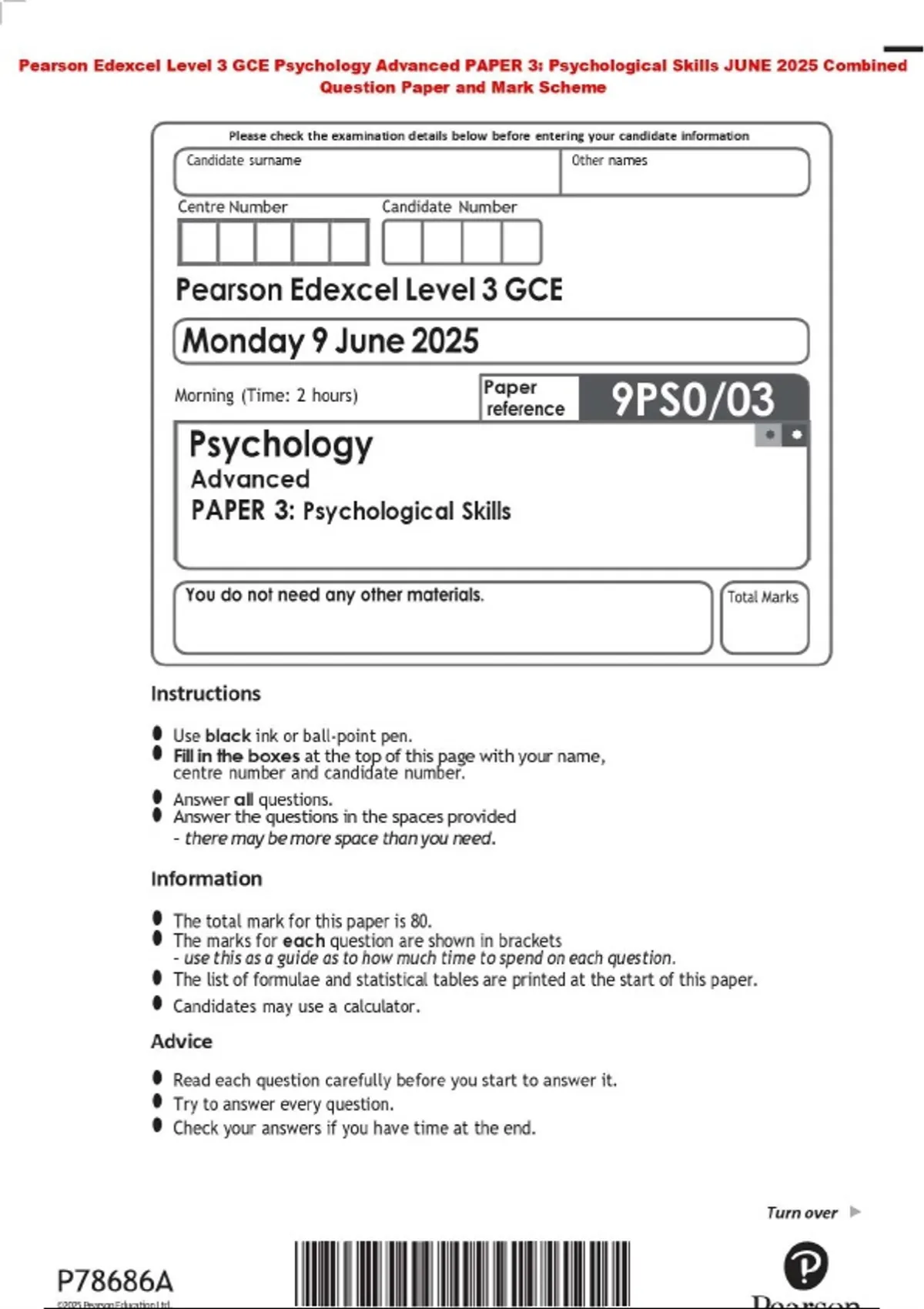 Pearson Edexcel Level 3 GCE Psychology Advanced PAPER 3: Psychological Skills JUNE 2025 Combined Question Paper and Mark Scheme