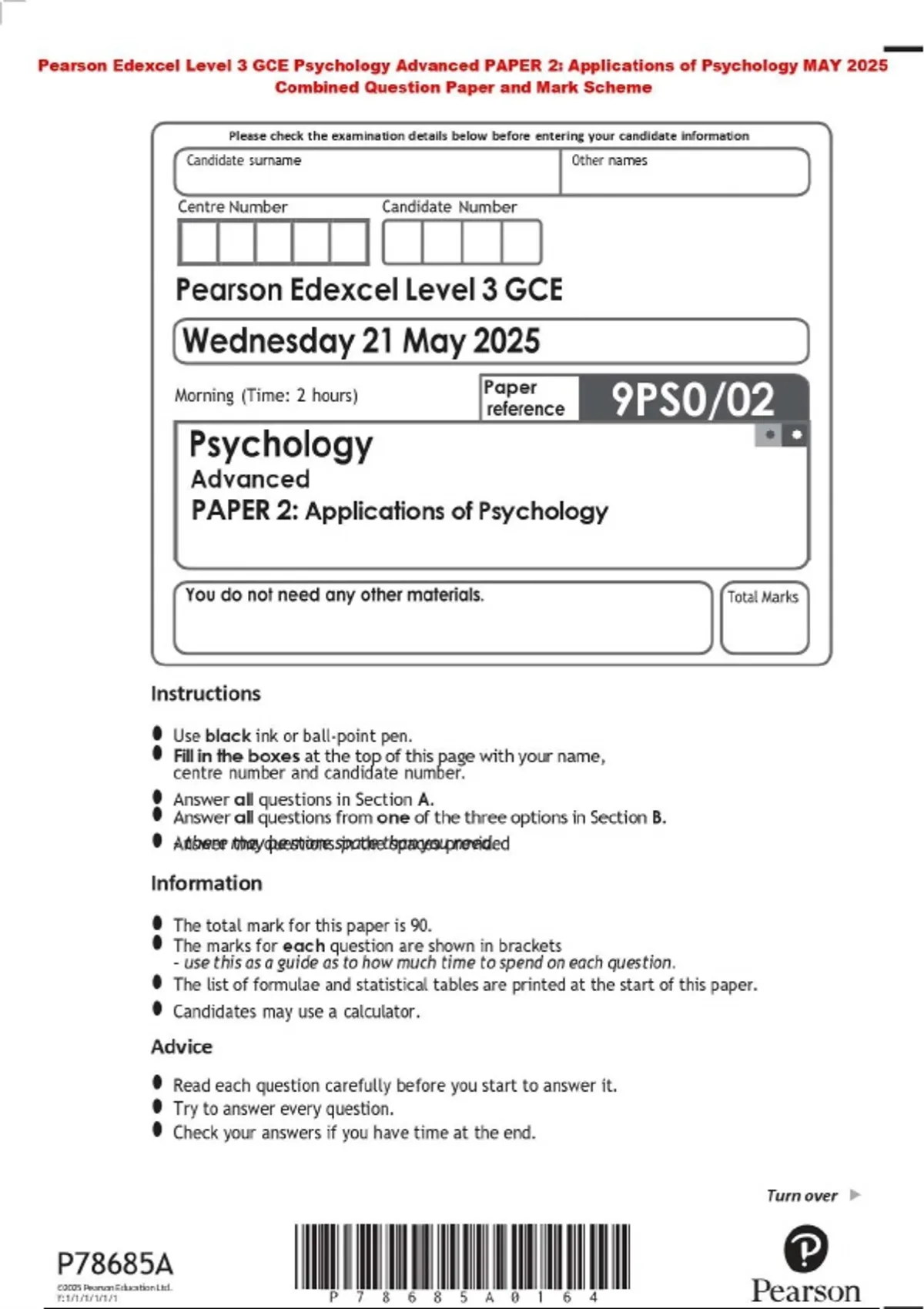 Pearson Edexcel Level 3 GCE Psychology Advanced PAPER 2: Applications of Psychology MAY 2025 Combined Question Paper and Mark Scheme