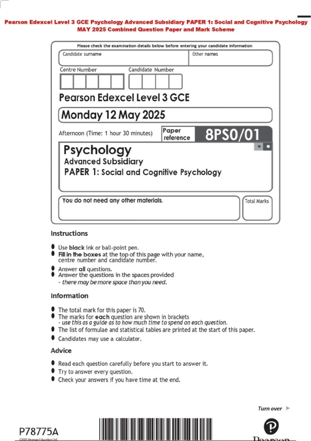 Pearson Edexcel Level 3 GCE Psychology Advanced Subsidiary PAPER 1: Social and Cognitive Psychology MAY 2025 Combined Question Paper and Mark Scheme