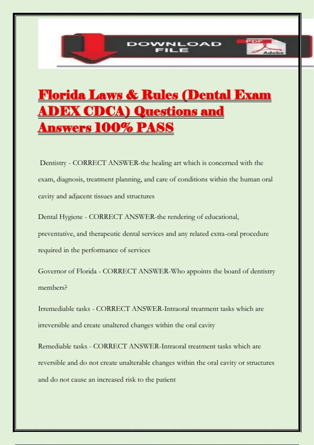 Florida Laws & Rules (Dental Exam ADEX CDCA) Questions and Answers 100% PASS