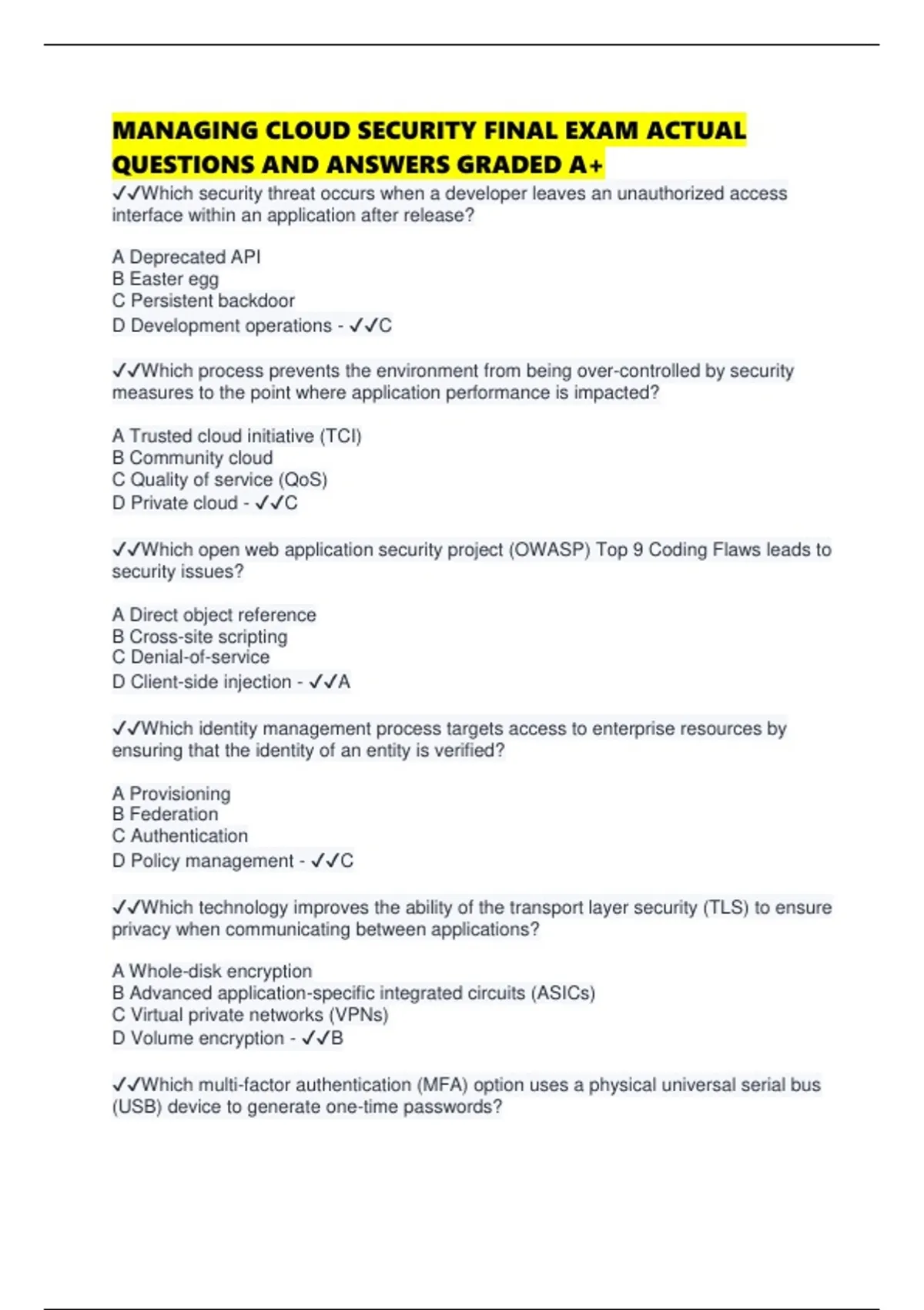 MANAGING CLOUD SECURITY FINAL EXAM ACTUAL QUESTIONS AND ANSWERS GRADED A+
