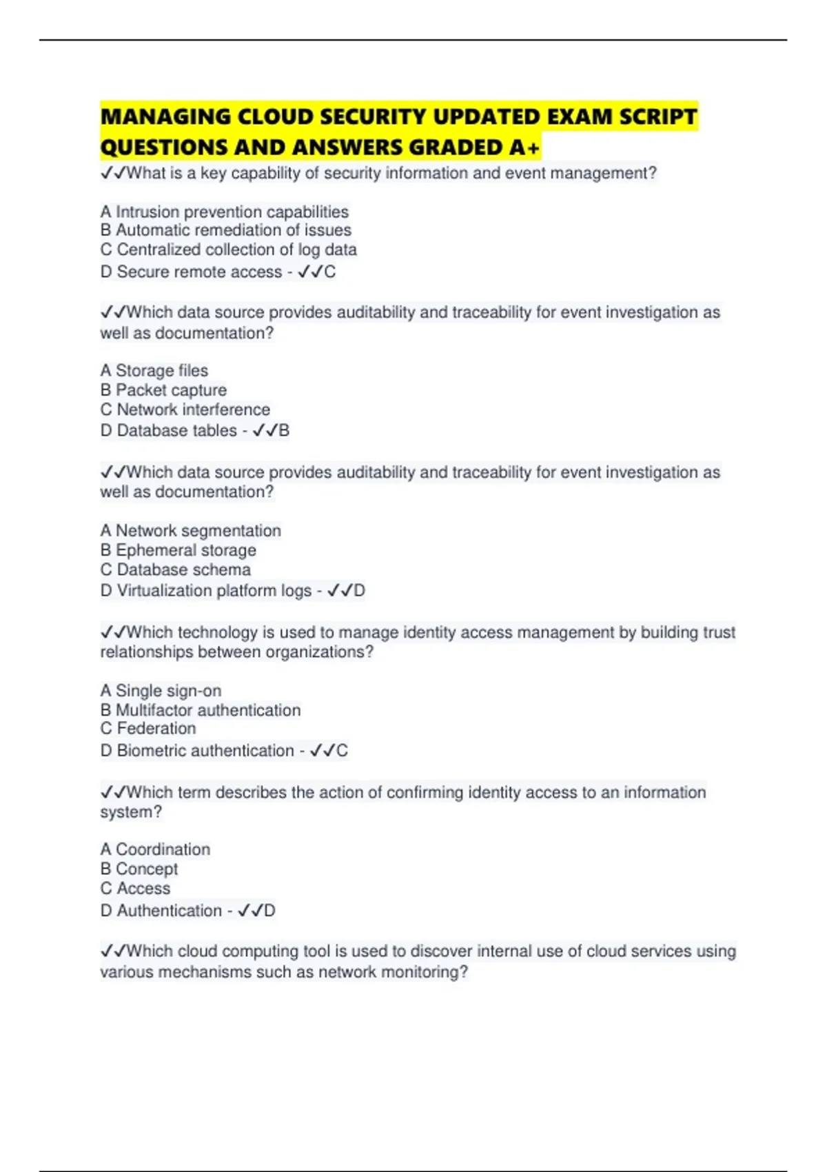 MANAGING CLOUD SECURITY UPDATED EXAM SCRIPT QUESTIONS AND ANSWERS GRADED A+