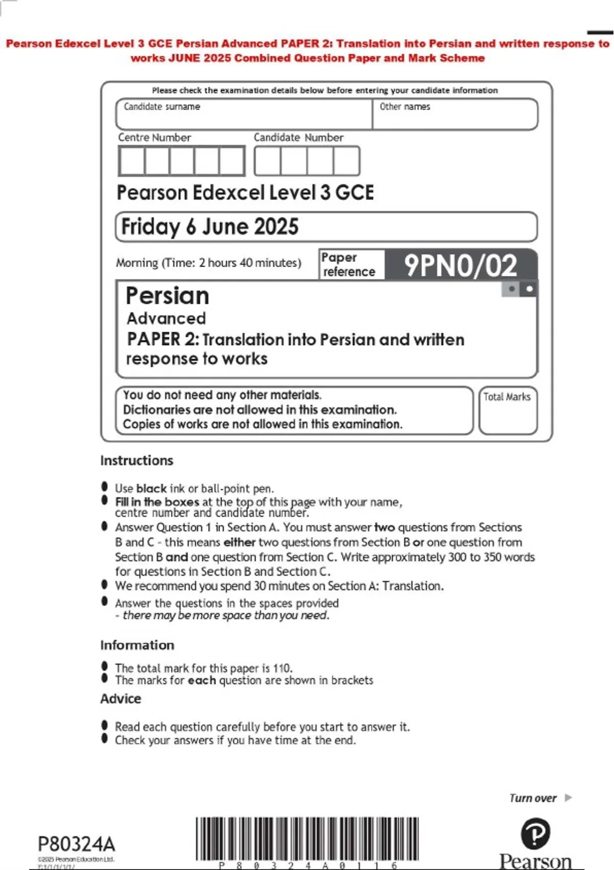 Pearson Edexcel Level 3 GCE Persian Advanced PAPER 2: Translation into Persian and written response to works JUNE 2025 Combined Question Paper and Mark Scheme