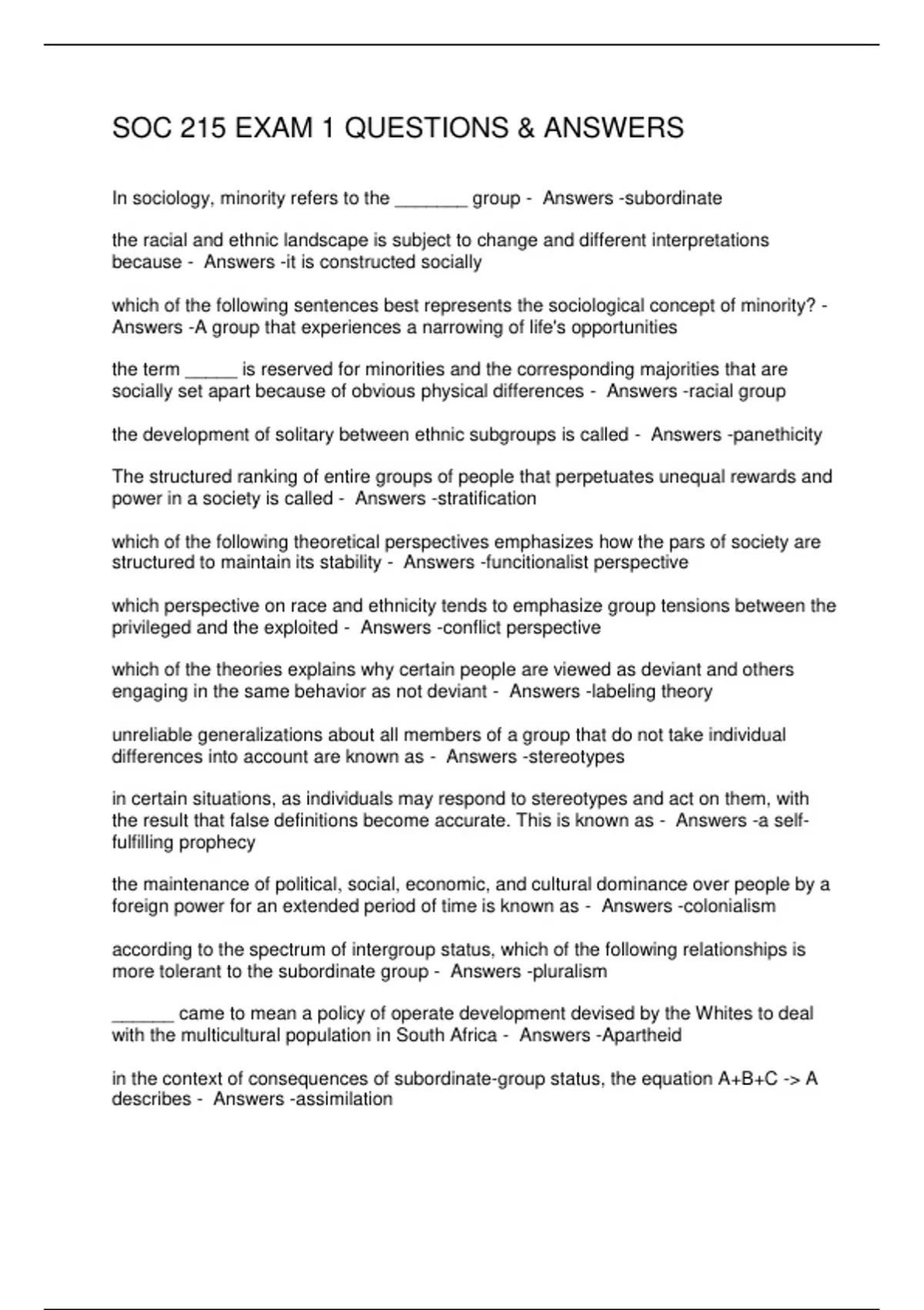 SOC 215 EXAM 1 QUESTIONS & ANSWERS