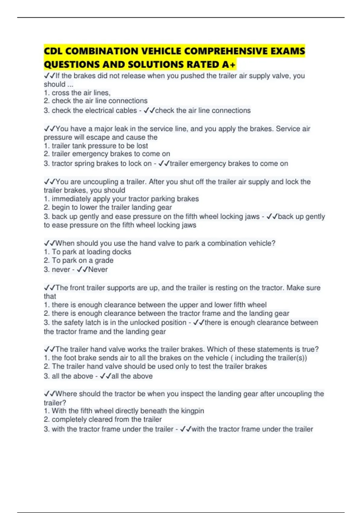 CDL COMBINATION VEHICLE COMPREHENSIVE EXAMS QUESTIONS AND SOLUTIONS RATED A+