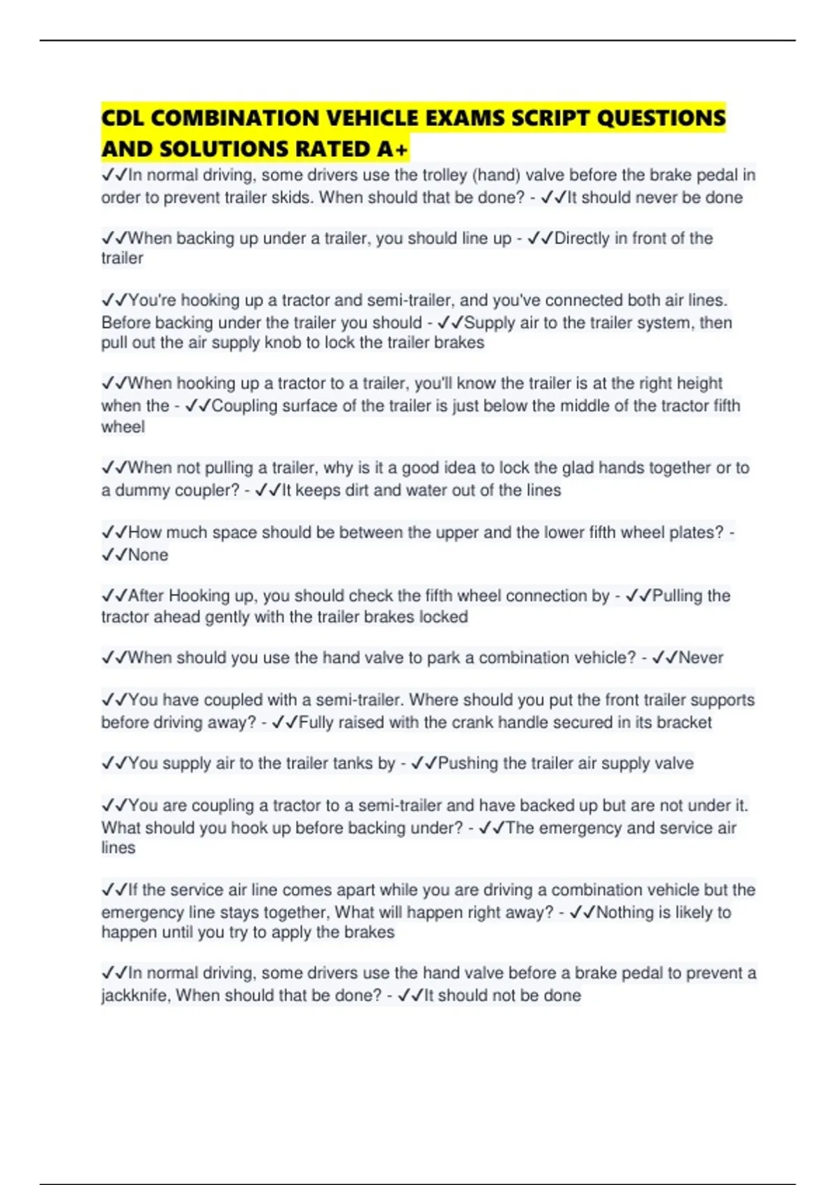 CDL COMBINATION VEHICLE EXAMS SCRIPT QUESTIONS AND SOLUTIONS RATED A+