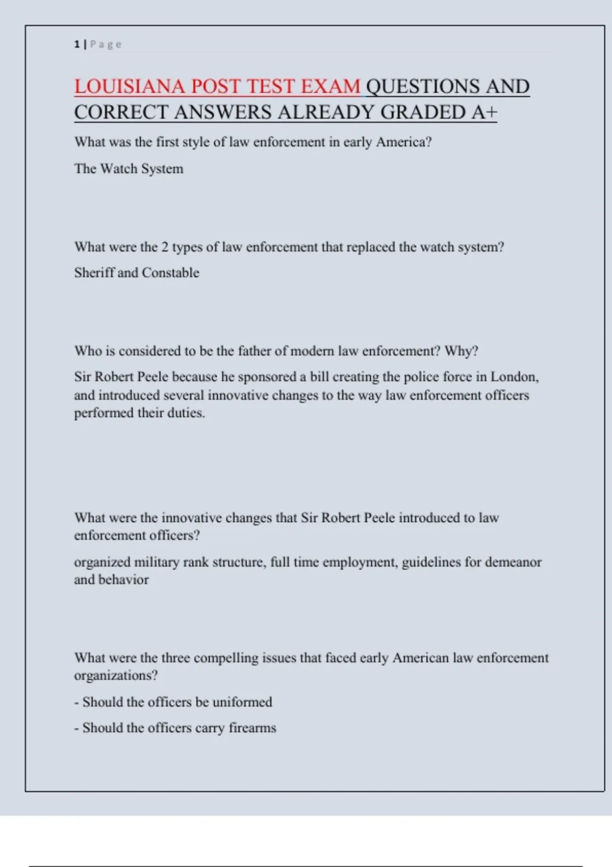 This document is an updated Louisiana POST Test Exam study guide containing comprehensive exam questions with correct, verified answers already graded for accuracy. It covers core law enforcement knowledge areas commonly tested on the Louisiana POST exam, including the history of policing, patrol functions, criminal and juvenile law, court procedures, use of force, bias awareness, ethics and professionalism, evidence handling, community relations, officer safety, and emergency response concepts. The material is organized in a clear question-and-answer format to support focused review and reinforce key concepts for effective Louisiana POST exam preparation.