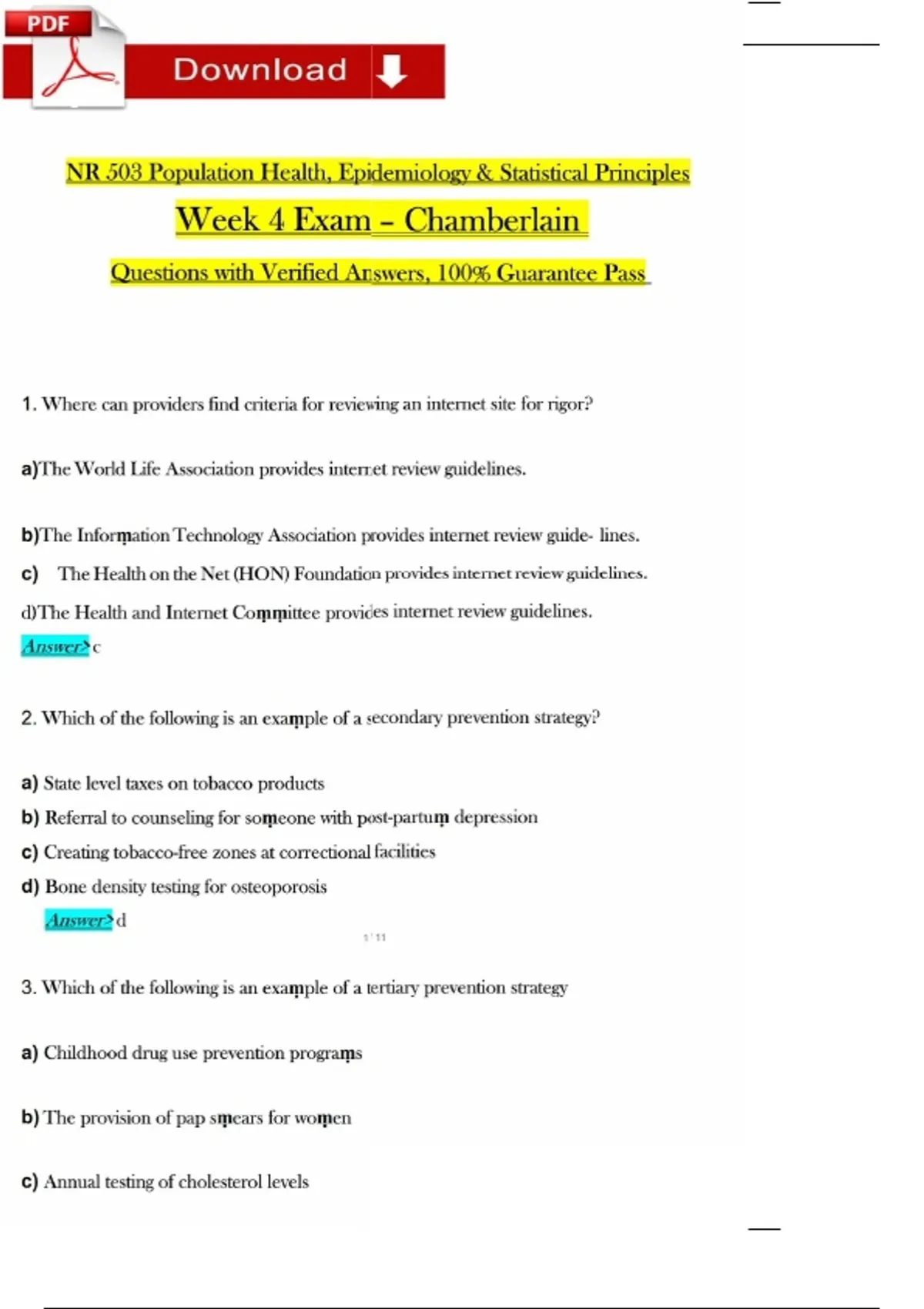 NR 503 Population Health, Epidemiology & Statistical Principles Week 4 Exam - Chamberlain Newest Update.pdf