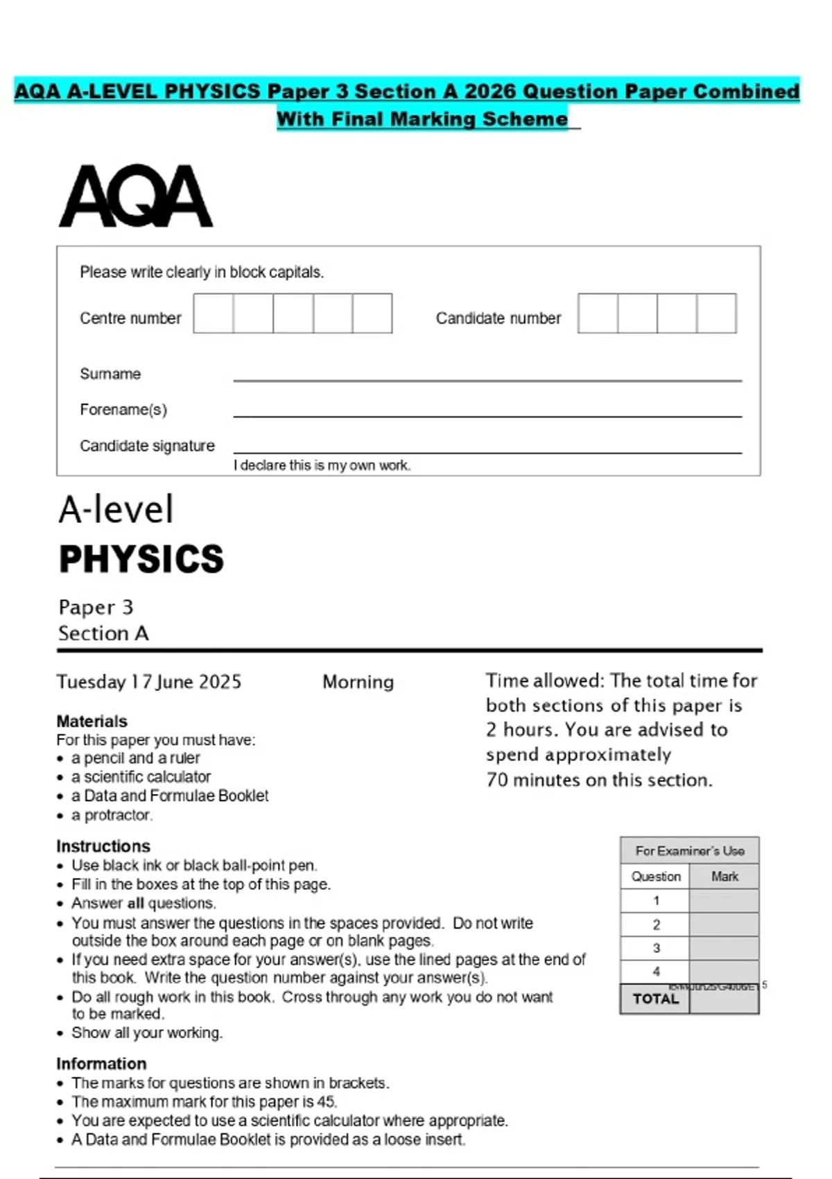 AQA A-LEVEL PHYSICS Paper 3 Section A 2026 Question Paper Combined With Final Marking Scheme