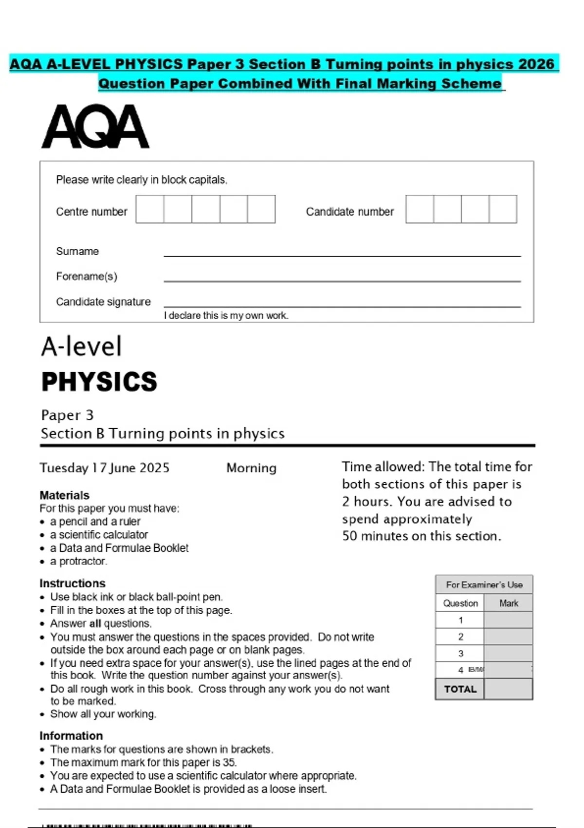 AQA A-LEVEL PHYSICS Paper 3 Section B Turning points in physics 2026 Question Paper Combined With Final Marking Scheme