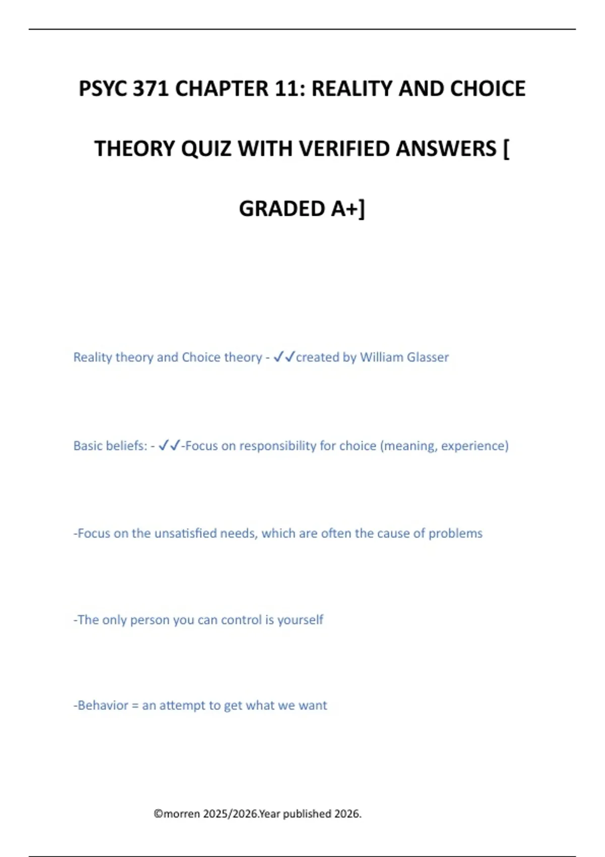 PSYC 371 CHAPTER 11: REALITY AND CHOICE THEORY QUIZ WITH VERIFIED ANSWERS [ GRADED A+] Reality theory and Choice theory - created by William Glasser Basic beliefs: - -Focus on responsibility for choice (meaning, experience) -Focus on the unsatisfied needs, which are often the cause of problems -The only person you can control is yourself -Behavior = an attempt to get what we want ©morren 2025/2026.Year published 2026.