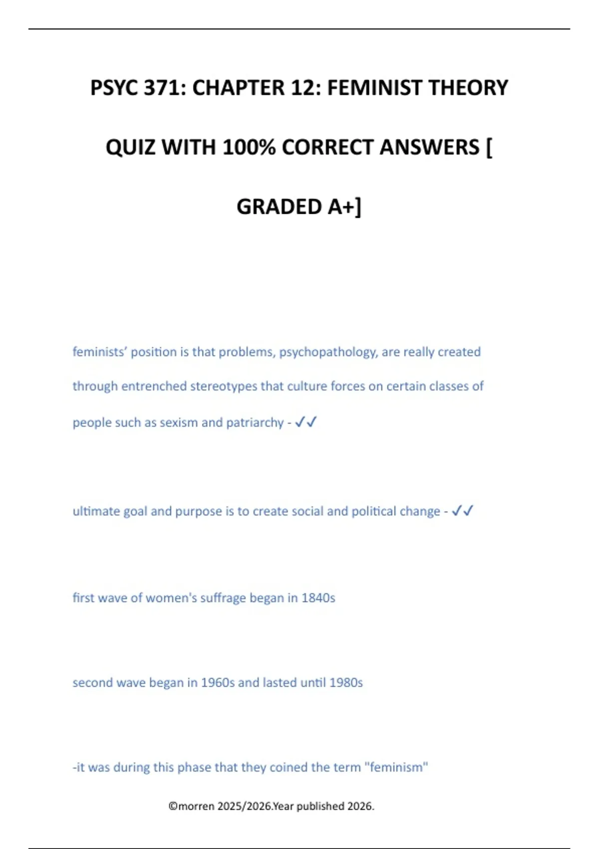 PSYC 371: CHAPTER 12: FEMINIST THEORY QUIZ WITH 100% CORRECT ANSWERS [ GRADED A+] feminists’ position is that problems, psychopathology, are really created through entrenched stereotypes that culture forces on certain classes of people such as sexism and patriarchy - ultimate goal and purpose is to create social and political change - f irst wave of women's suffrage began in 1840s second wave began in 1960s and lasted until 1980s -it was during this phase that they coined the term "feminism" ©morren 2025/2026.Year published 2026.
