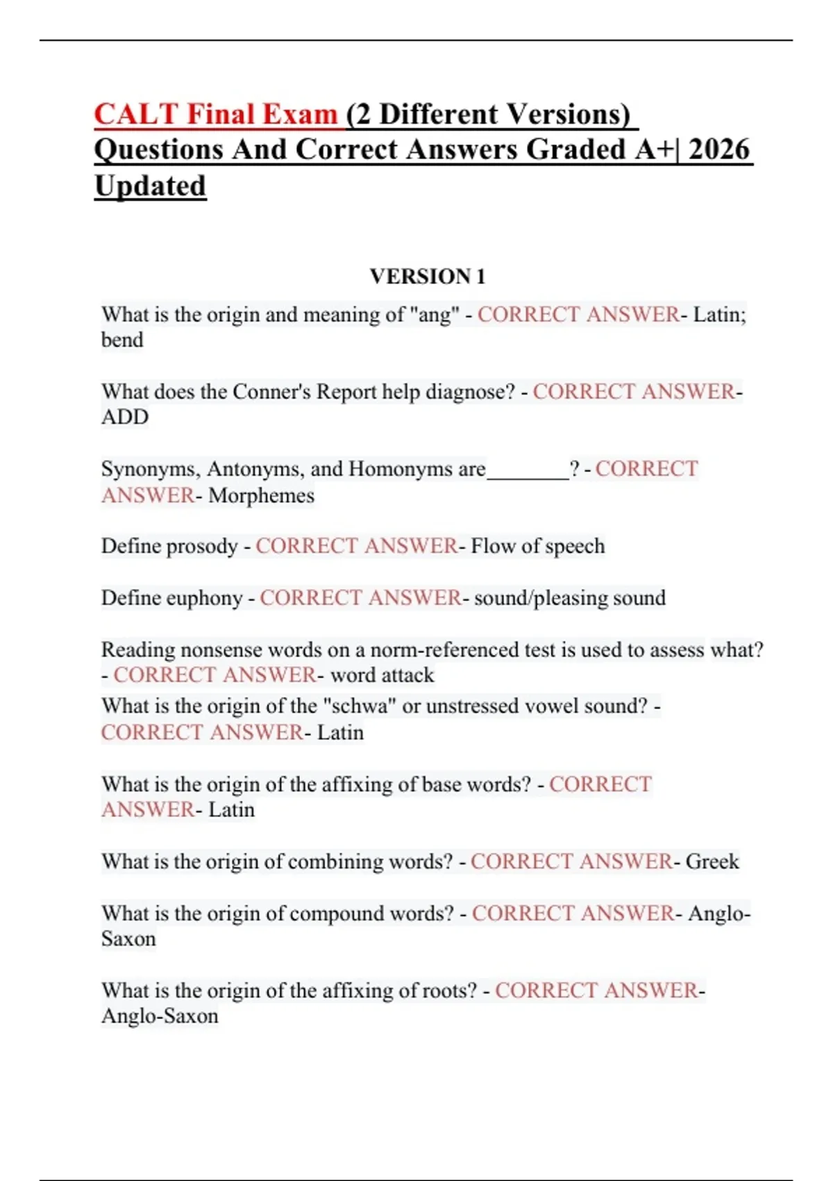 This resource provides an updated collection of CALT final questions with clearly presented correct answers, covering key concepts in phonology, morphology, syntax, semantics, assessment types, language origins, instructional methods, and reading-related terminology. It is designed as a concise reference for reviewing essential definitions, principles, and frequently tested topics, making it useful for quick study, refreshers, and targeted review of core CALT content in an easy-to-follow format.