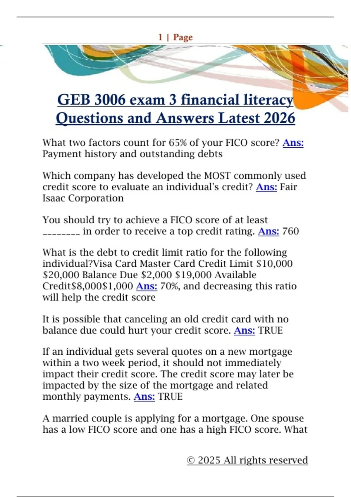 GEB 3006 exam 3 financial literacy Questions and Answers Latest 2026