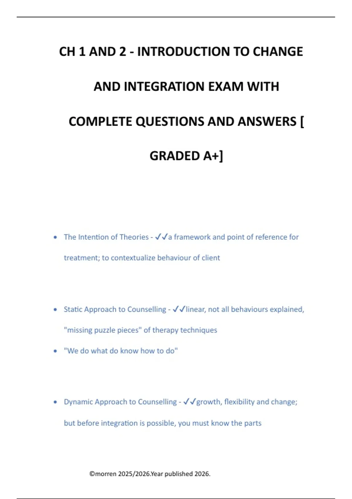 CH 1 AND 2 - INTRODUCTION TO CHANGE AND INTEGRATION EXAM WITH COMPLETE QUESTIONS AND ANSWERS [ GRADED A+] • The Intention of Theories - a framework and point of reference for treatment; to contextualize behaviour of client • Static Approach to Counselling - linear, not all behaviours explained, "missing puzzle pieces" of therapy techniques • "We do what do know how to do" • Dynamic Approach to Counselling - growth, flexibility and change; but before integration is possible, you must know the parts ©morren 2025/2026.Year published 2026.