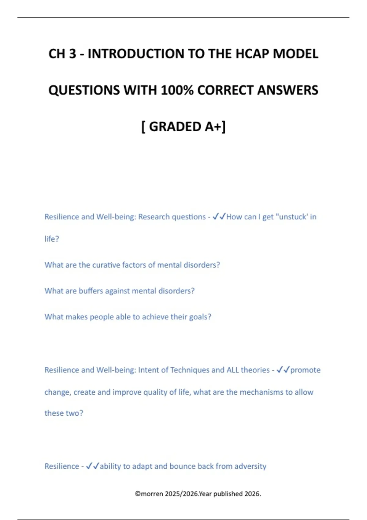 CH 3 - INTRODUCTION TO THE HCAP MODEL QUESTIONS WITH 100% CORRECT ANSWERS [ GRADED A+] Resilience and Well-being: Research questions - How can I get "unstuck' in life? What are the curative factors of mental disorders? What are buffers against mental disorders? What makes people able to achieve their goals? Resilience and Well-being: Intent of Techniques and ALL theories - promote change, create and improve quality of life, what are the mechanisms to allow these two? Resilience - ability to adapt and bounce back from adversity ©morren 2025/2026.Year published 2026.