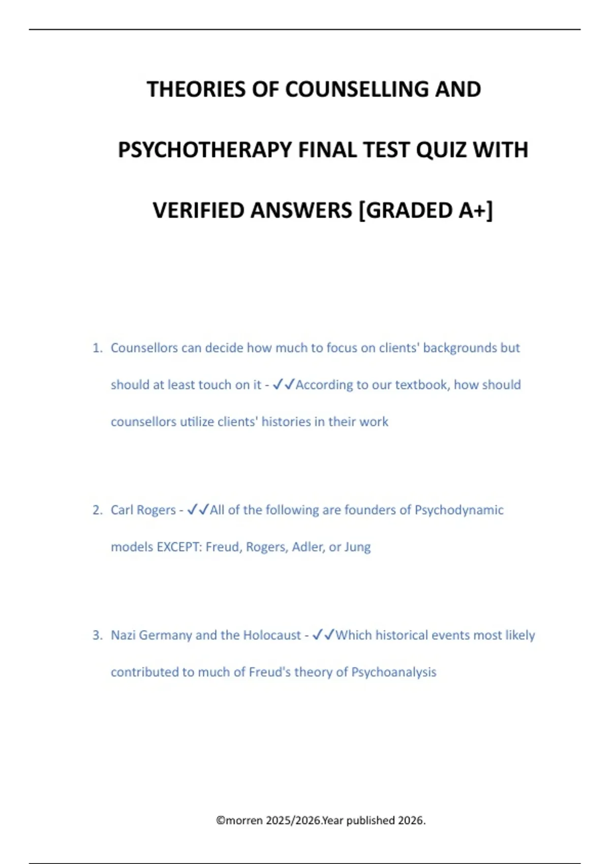 THEORIES OF COUNSELLING AND PSYCHOTHERAPY FINAL TEST QUIZ WITH VERIFIED ANSWERS [GRADED A+] 1. Counsellors can decide how much to focus on clients' backgrounds but should at least touch on it - According to our textbook, how should counsellors utilize clients' histories in their work 2. Carl Rogers - All of the following are founders of Psychodynamic models EXCEPT: Freud, Rogers, Adler, or Jung 3. Nazi Germany and the Holocaust - Which historical events most likely contributed to much of Freud's theory of Psychoanalysis ©morren 2025/2026.Year published 2026. 4. Id, Ego, and Superego - Freud understood that personality consists of which three structures 5. Id - Which system of personality is concerned with obtaining pleasure 6. Oral (first year; related to later mistrust and rejection issues), Anal (ages 1-3; related to later personal power issues), Phallic (ages 3-6; related to later sexual attitudes), Latency (ages 6-12; a time of socialization), Genital (ages 12-60; sexual energies are invested in life) - List Freud's Stages of Development 7. Ego - This system of personality is concerned with the reality principle 8. Superego - This system of personality is concerned with the moral principle ©morren 2025/2026.Year published 2026.