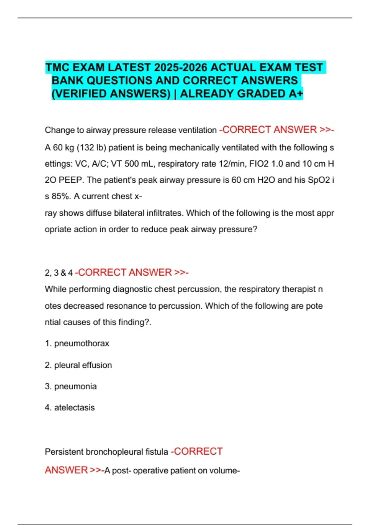 This document includes a comprehensive test bank of practice questions designed to prepare candidates for the TMC (Therapist Multiple-Choice) exam. It features verified correct answers to support review of respiratory care concepts, clinical scenarios, and exam-style questions aligned with the 2025–2026 exam content.
