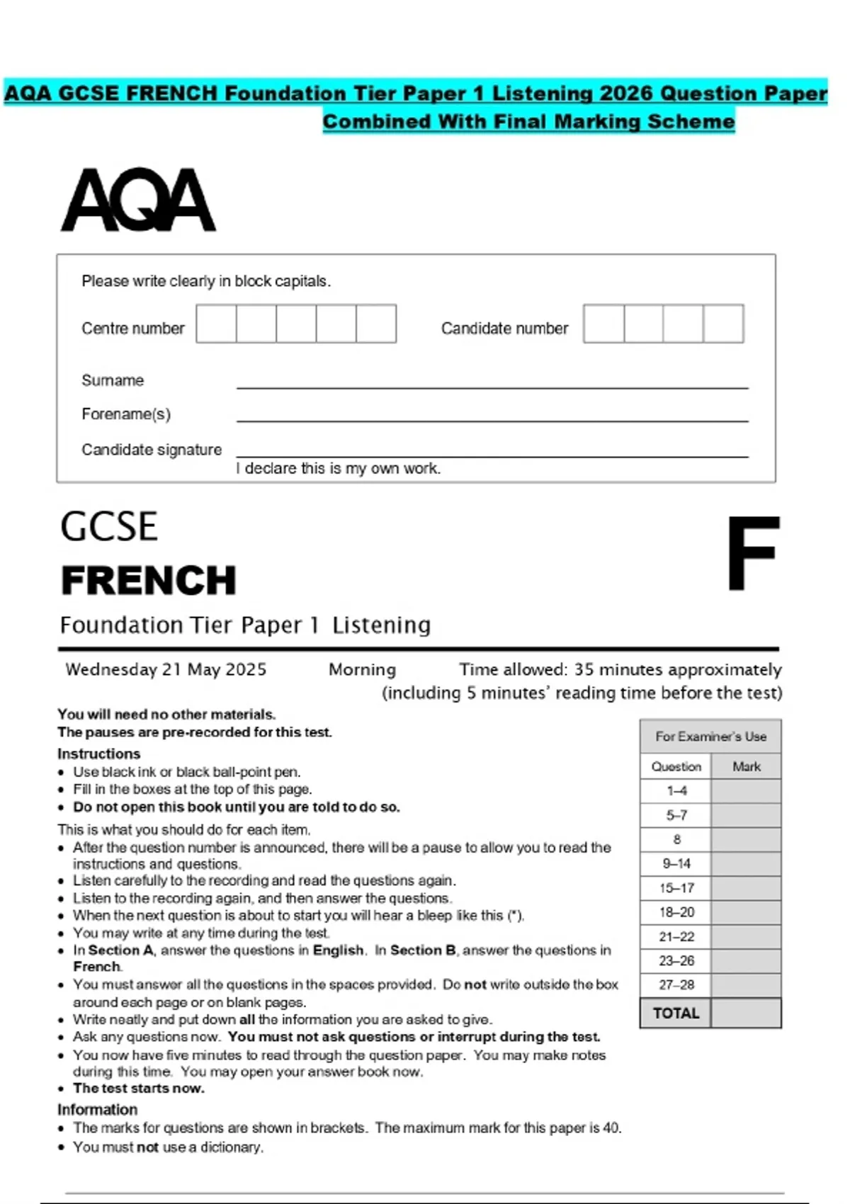 AQA GCSE FRENCH Foundation Tier Paper 1 Listening 2026 Question Paper Combined With Final Marking Scheme