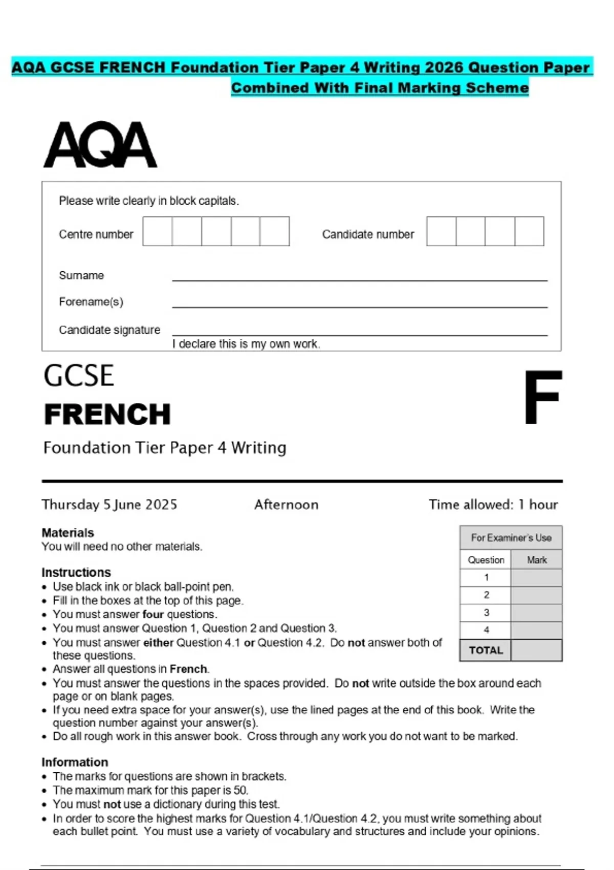 AQA GCSE FRENCH Foundation Tier Paper 4 Writing 2026 Question Paper Combined With Final Marking Scheme