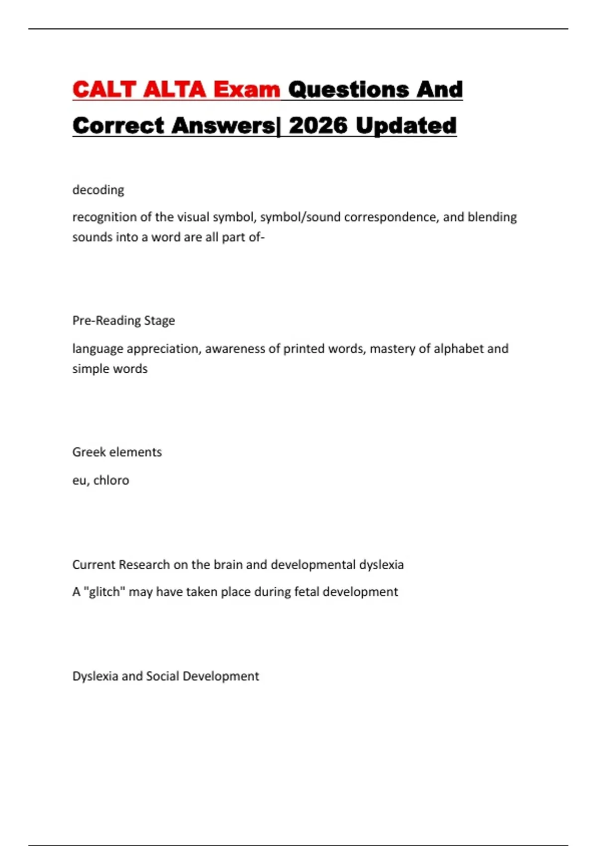 This resource provides a comprehensive collection of practice questions and verified answers designed to support preparation for the CALT/ALTA exam, covering core concepts such as dyslexia, phonology, multisensory structured language education, assessment methods, reading and spelling development, and instructional strategies. The material reflects the scope of content typically addressed on the exam and serves as a focused review tool for candidates seeking to reinforce key terminology, theoretical foundations, and practical applications relevant to academic language therapy.