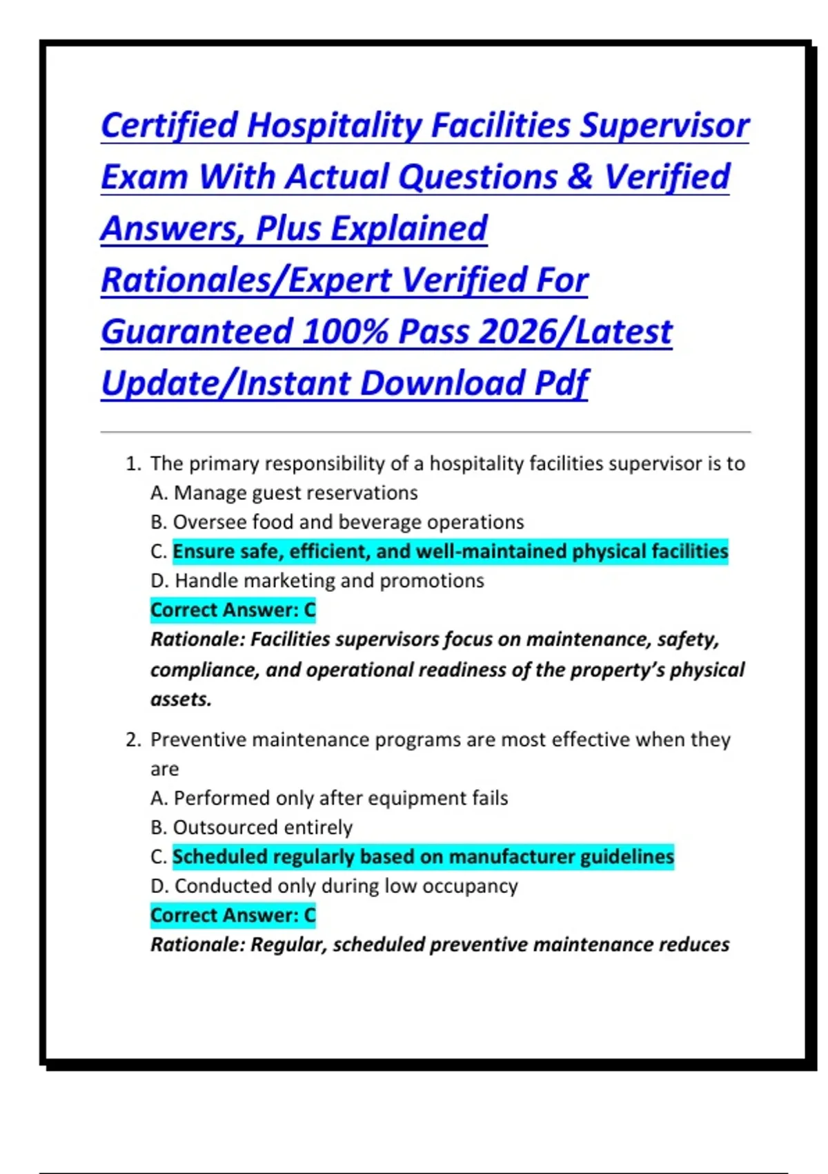 Certified Hospitality Facilities Supervisor Exam With Actual Questions & Verified Answers, Plus Explained Rationales/Expert Verified For Guaranteed 100% Pass 2026/Latest Update/Instant Download Pdf