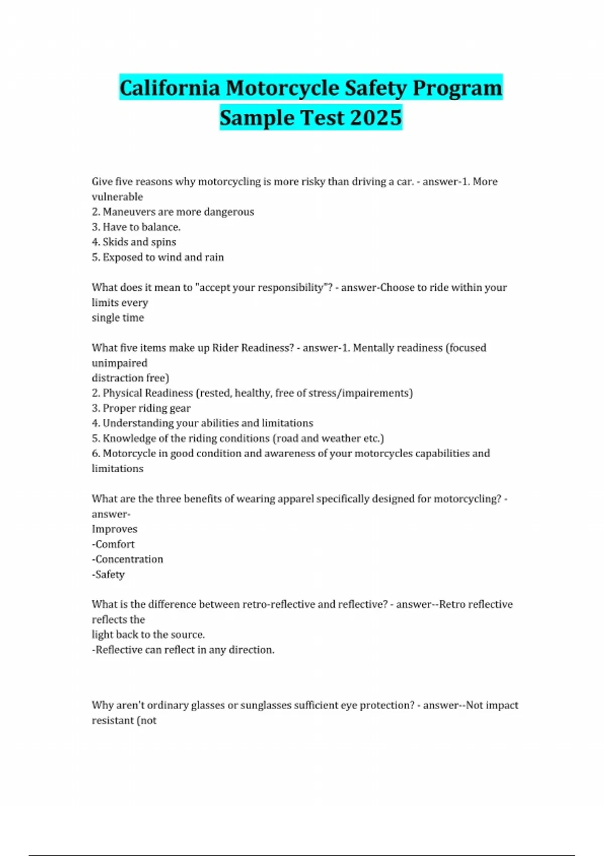 California Motorcycle Safety Program Sample Test 2025 Give five reasons why motorcycling is more risky than driving a car. - answer-1. More vulnerable 2. Maneuvers are more dangerous 3. Have to balance. 4. Skids and spins 5. Exposed to wind and rain What does it mean to "accept your responsibility"? - answer-Choose to ride within your limits every single time What five items make up Rider Readiness? - answer-1. Mentally readiness (focused unimpaired distraction free) 2. Physical Readiness (rested, healthy, free of stress/impairements) 3. Proper riding gear 4. Understanding your abilities and limitations 5. Knowledge of the riding conditions (road and weather etc.) 6. Motorcycle in good condition and awareness of your motorcycles capabilities and limitations What are the three benefits of wearing apparel specifically designed for motorcycling? - answer- Improves -Comfort -Concentration -Safety What is the difference between retro-reflective and reflective? - answer--Retro reflective reflects the light back to the source. -Reflective can reflect in any direction. Why aren't ordinary glasses or sunglasses sufficient eye protection? - answer--Not impact resistant (not shatter proof) -Not secured