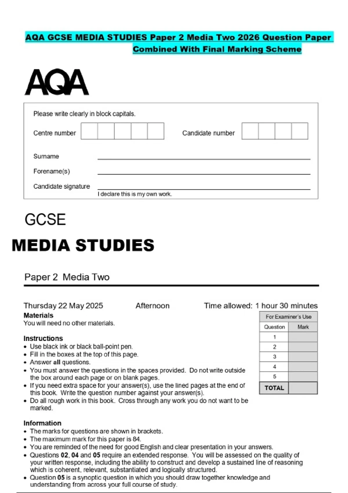 AQA GCSE MEDIA STUDIES Paper 2 Media Two 2026 Question Paper Combined With Final Marking Scheme