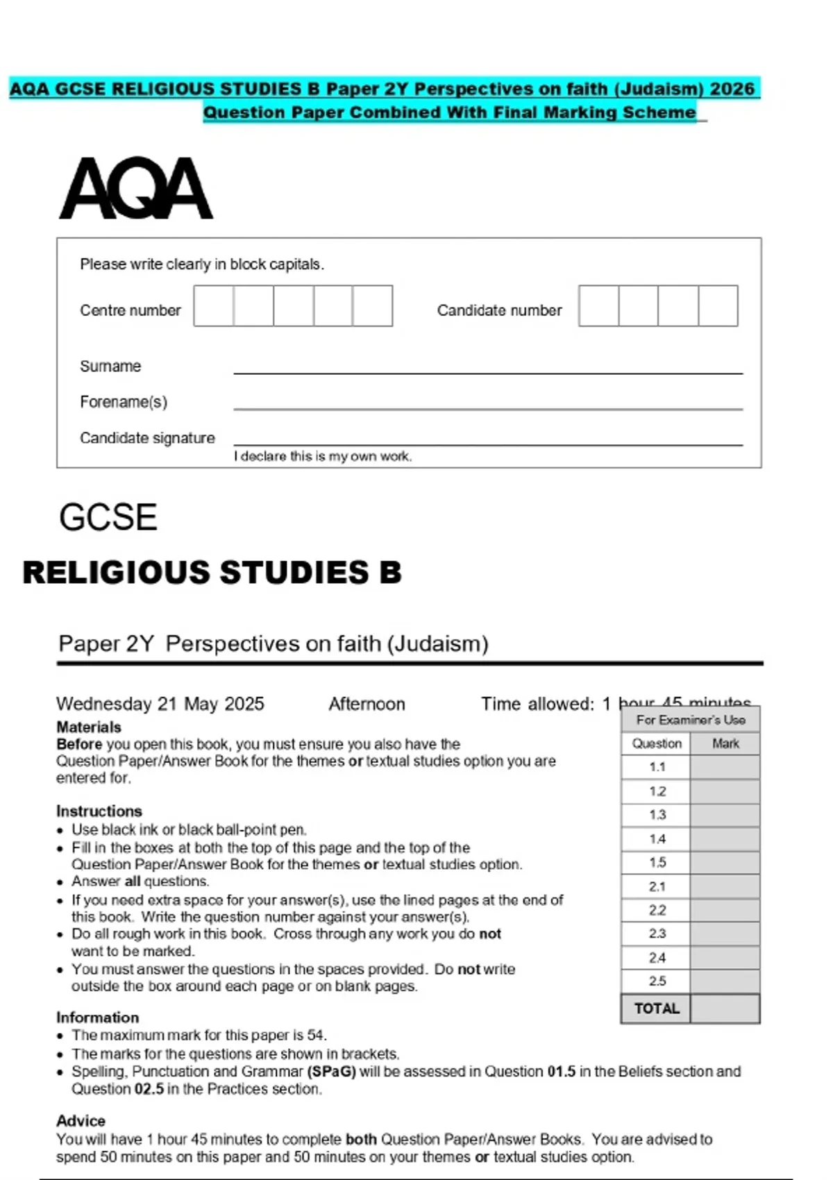AQA GCSE RELIGIOUS STUDIES B Paper 2Y Perspectives on faith (Judaism) 2026 Question Paper Combined With Final Marking Scheme