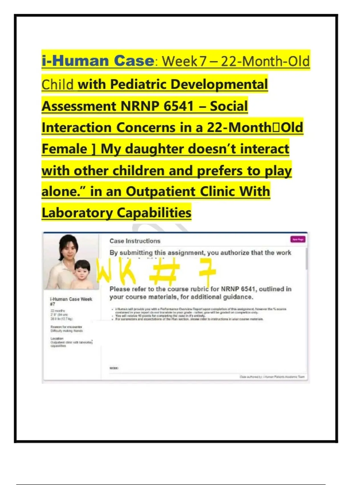 i-Human Case: Week 7 – 22-Month-Old Child with Pediatric Developmental Assessment NRNP 6541 – Social Interaction Concerns in a 22-MonthOld Female ] My daughter doesn’t interact with other children and prefers to play alone.” in an Outpatient Clinic With Laboratory Capabilities