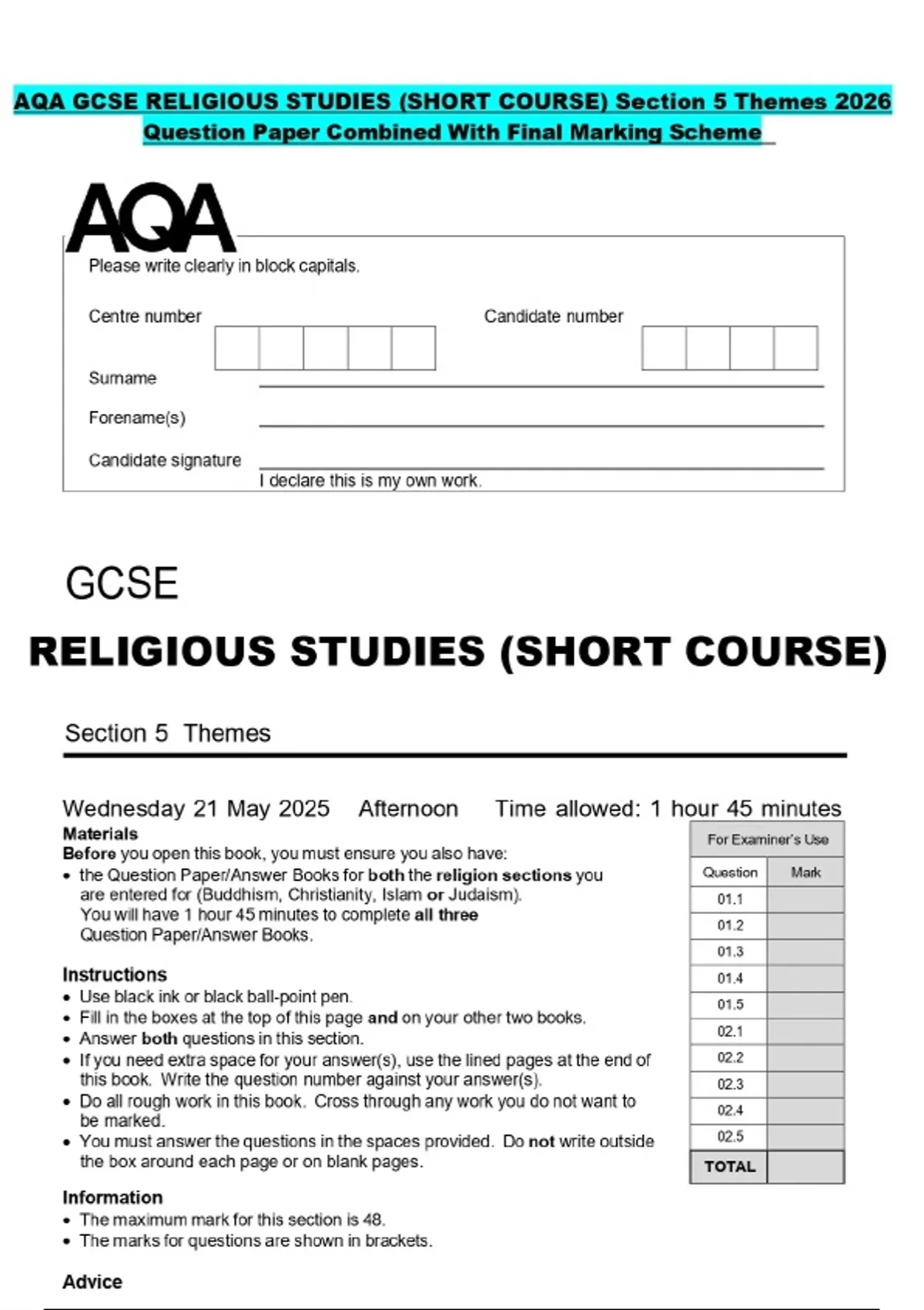 AQA GCSE RELIGIOUS STUDIES (SHORT COURSE) Section 5 Themes 2026 Question Paper Combined With Final Marking Scheme