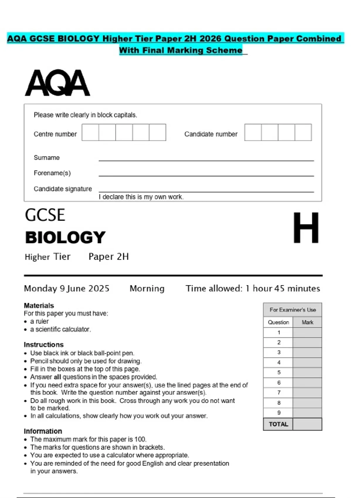 AQA GCSE BIOLOGY Higher Tier Paper 2H 2026 Question Paper Combined With Final Marking Scheme