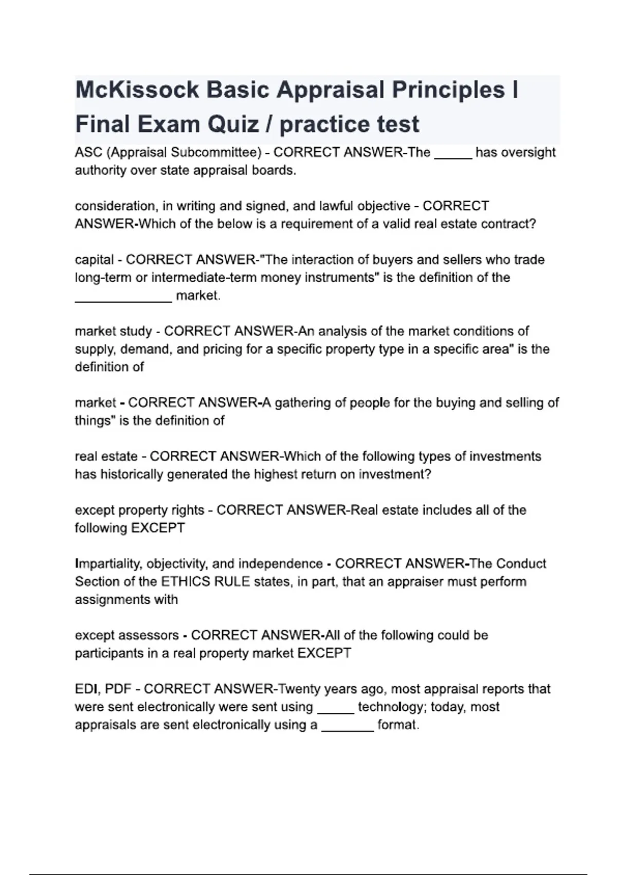 McKissock Basic Appraisal Principles I Final Exam Quiz practice test questions and answers
