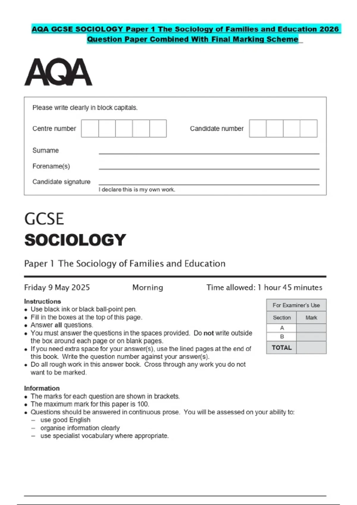 AQA GCSE SOCIOLOGY Paper 1 The Sociology of Families and Education 2026 Question Paper Combined With Final Marking Scheme
