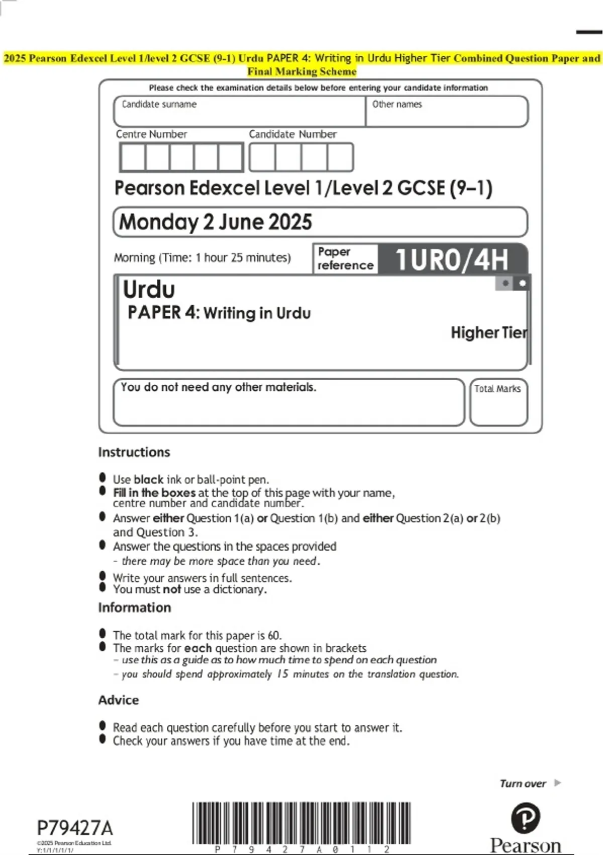 2025 Pearson Edexcel Level 1/level 2 GCSE (9-1) Urdu PAPER 4: Writing in Urdu Higher Tier Examination Paper and Final Marking Scheme