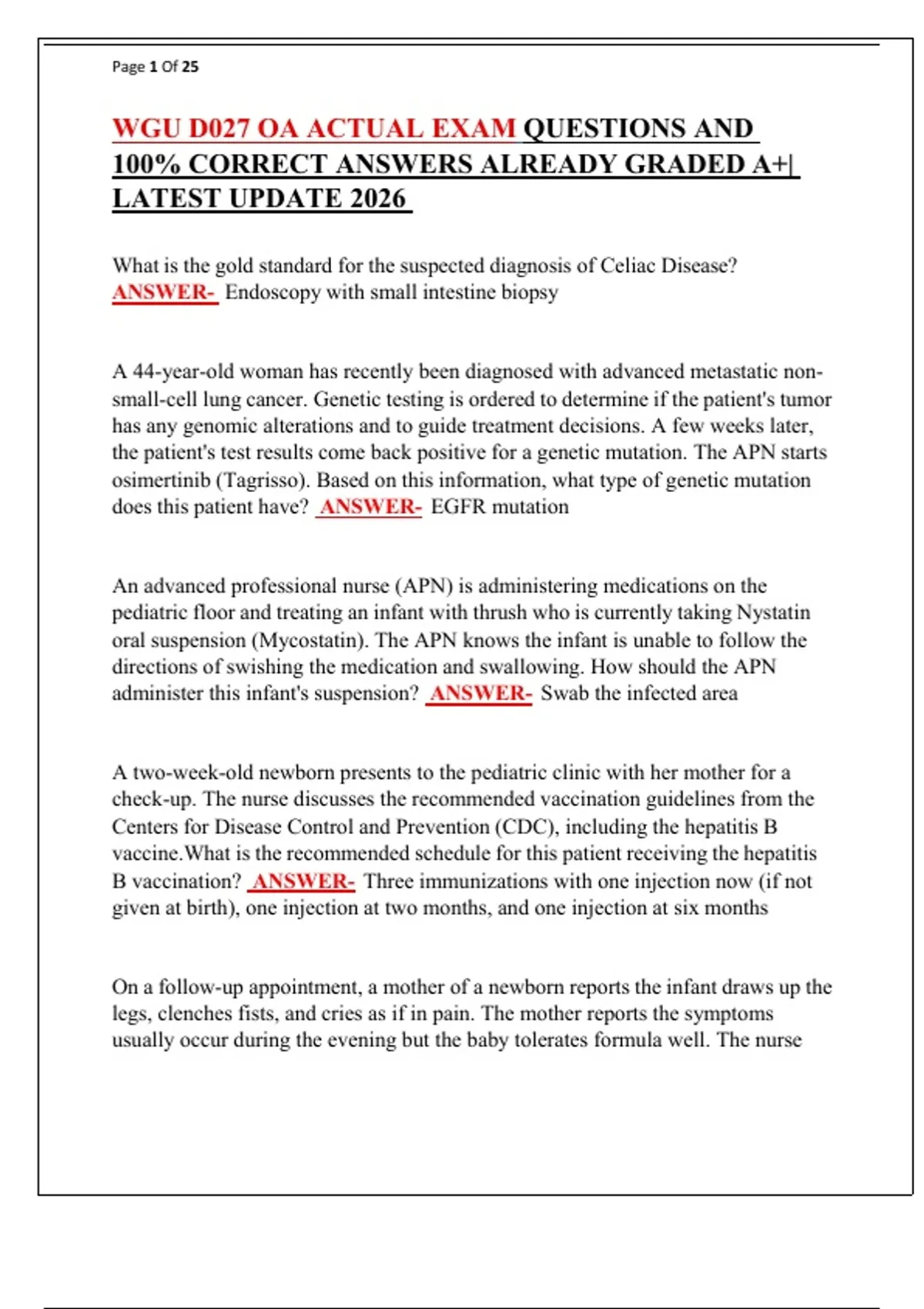 This updated WGU D027 OA study resource provides a comprehensive collection of clearly explained questions and verified answers covering key clinical, pharmacology, pathophysiology, and decision-making topics commonly assessed in the course. The content reflects the latest update and is organized to support efficient review, reinforce core concepts, and help learners quickly identify correct responses and rationales across a wide range of scenarios relevant to advanced nursing practice.