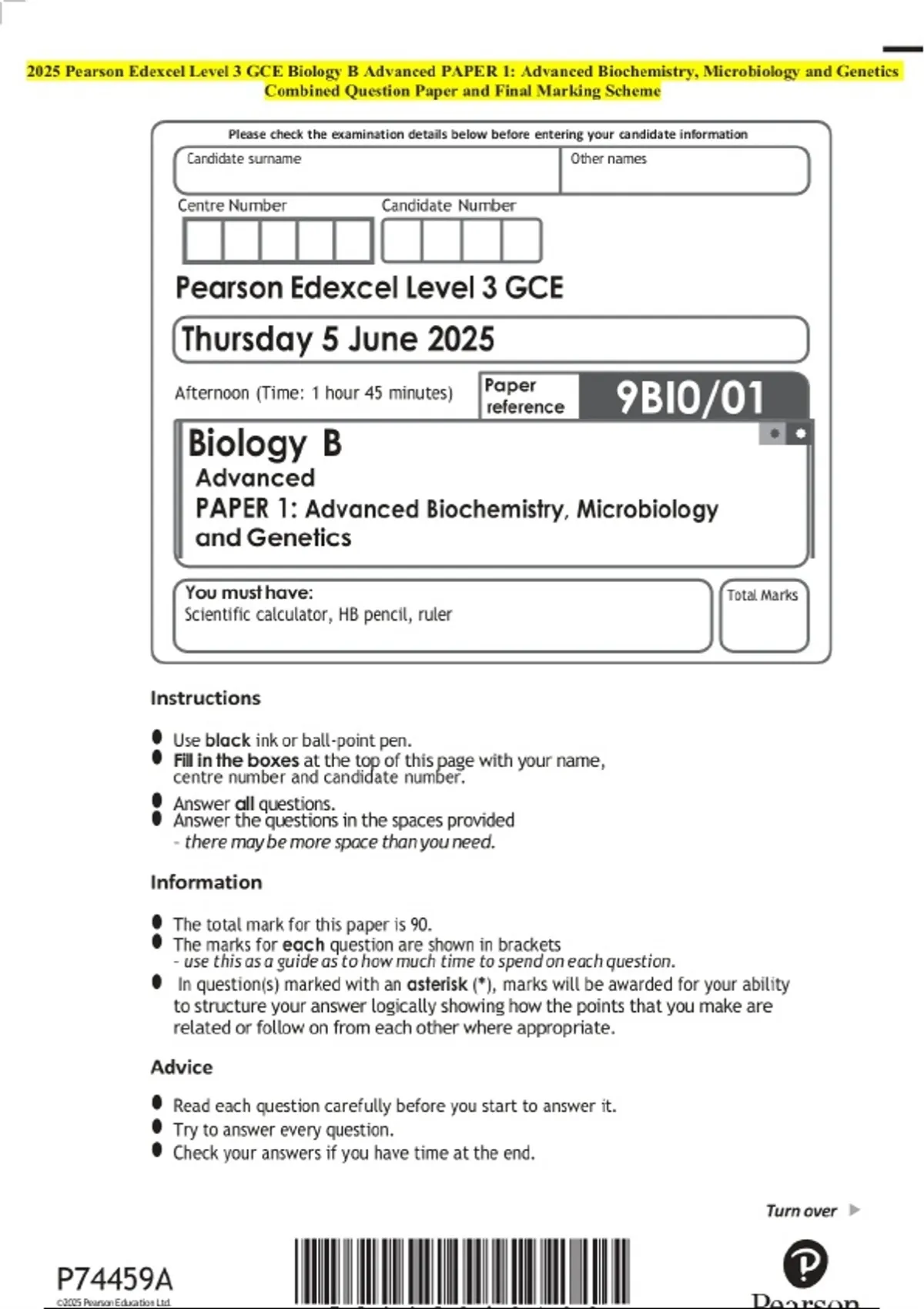 2025 Pearson Edexcel Level 3 GCE Biology B Advanced PAPER 1: Advanced Biochemistry, Microbiology and Genetics Examination Paper and Final Marking Scheme