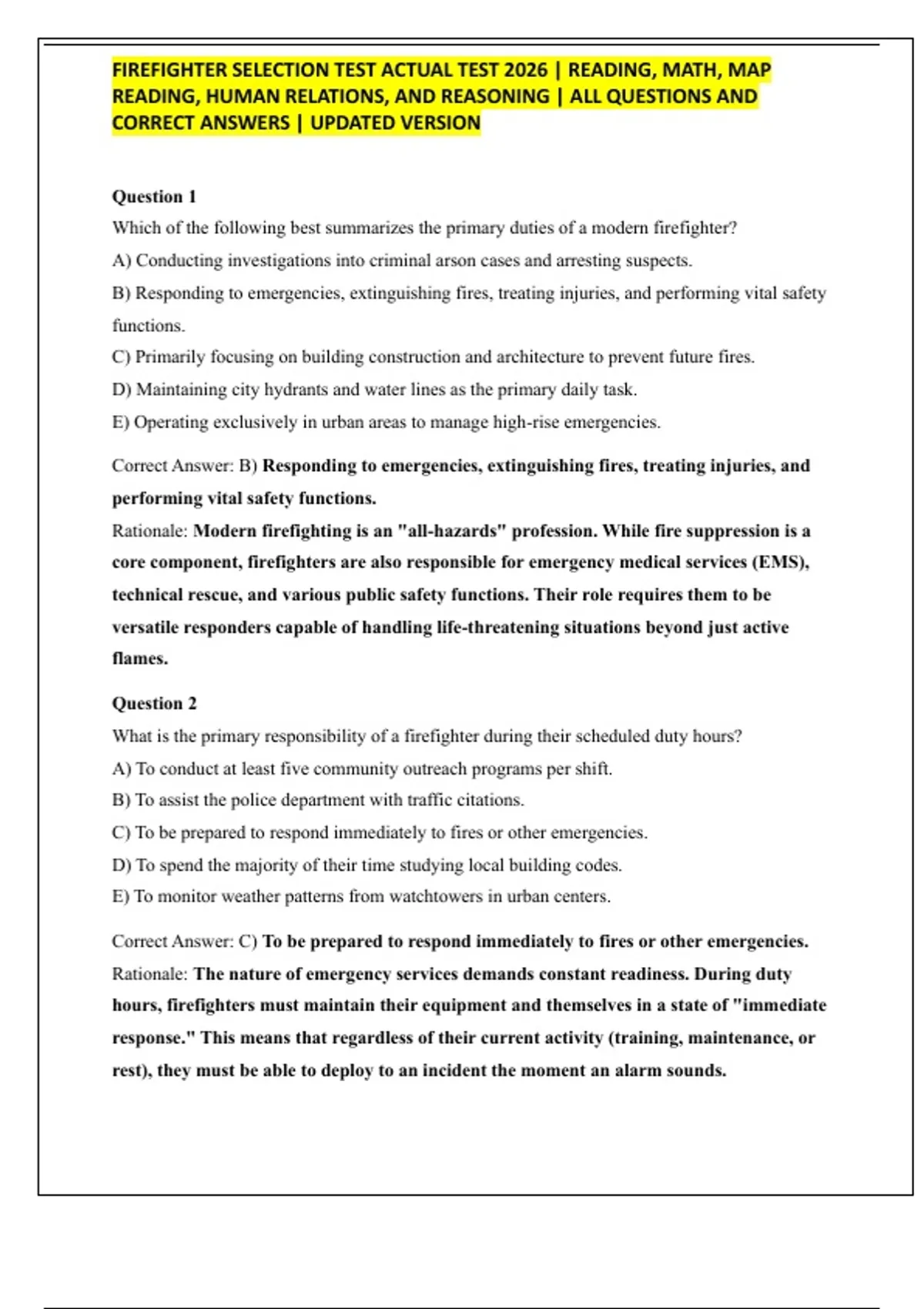 FIREFIGHTER SELECTION TEST ACTUAL TEST 2026 | READING, MATH, MAP READING, HUMAN RELATIONS, AND REASONING | ALL QUESTIONS AND CORRECT ANSWERS | UPDATED VERSION