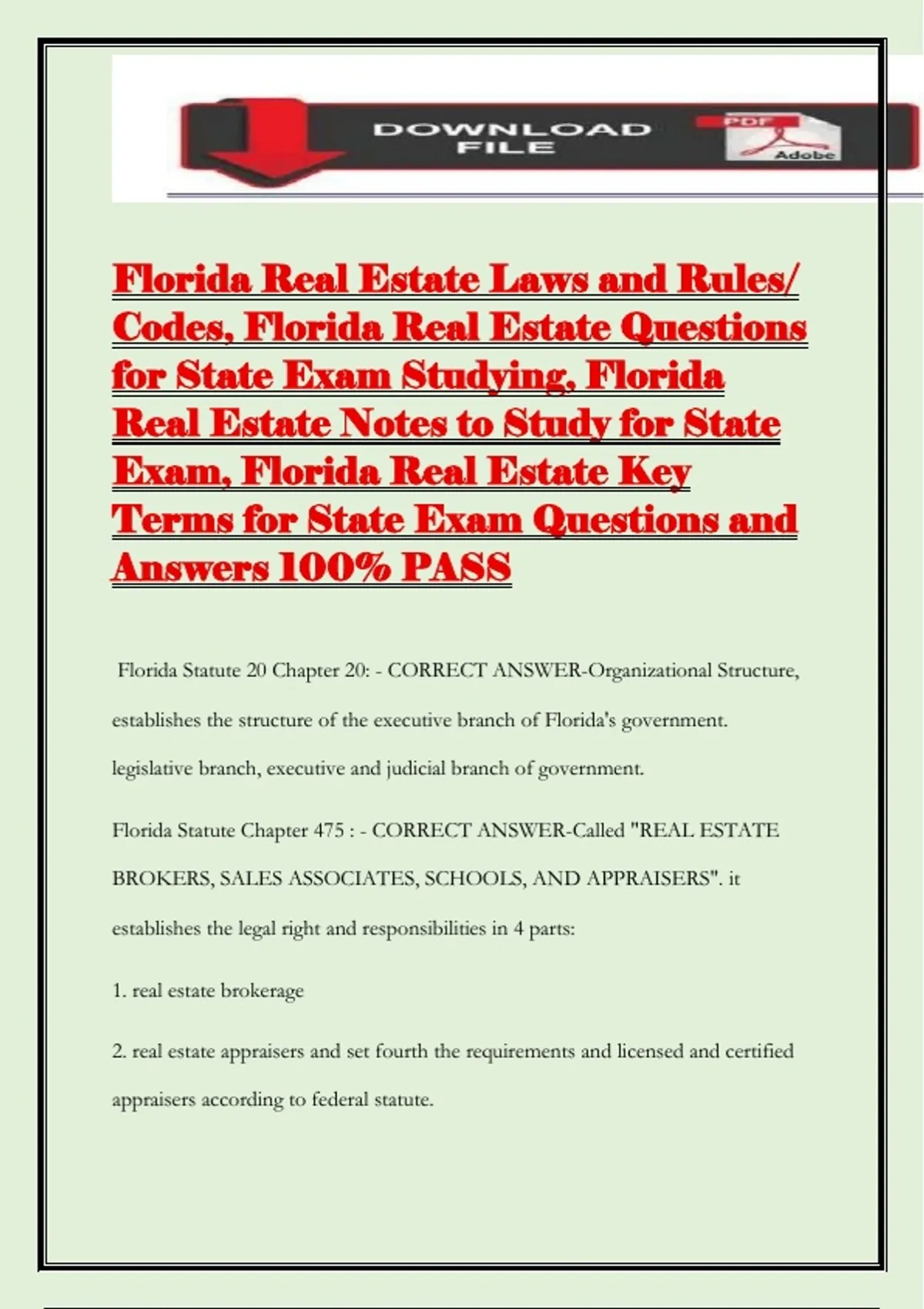 Florida Statute Chapter 475 : - CORRECT ANSWER-Called "REAL ESTATE