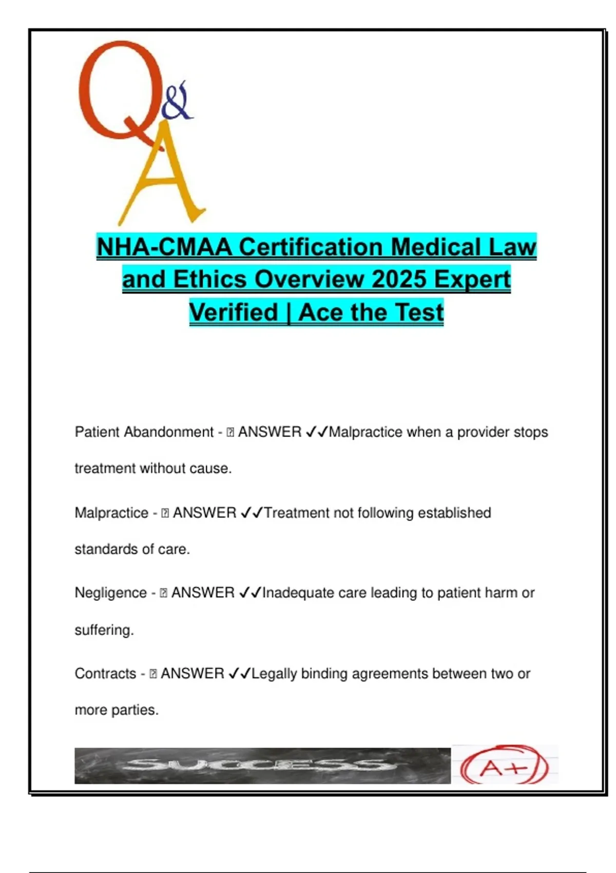 This document contains 40+ expert-verified questions and answers focused on Medical Law and Ethics for the Certified Medical Administrative Assistant (CMAA) exam by the National Healthcareer Association (NHA), updated for the 2025/2026 exam cycle. Structured for rapid learning and legal comprehension, this guide provides exam-ready content based on real-world administrative healthcare responsibilities and compliance frameworks. Topics include: Legal Concepts: malpractice, negligence, abandonment, and contract law Patient Rights: Patient Bill of Rights, ADAAA, informed and implied consent, waived consent HIPAA & Health Information: definitions of PHI and IIHI, the Minimum Necessary Rule, penalties for violations, and patient rights to access/correct records OSHA & Safety Standards: Safety Data Sheets (SDS), incident reporting, emergency procedures, and environmental hazards Professional Ethics & Scope of Practice: CMAA role limits, national safety goals, code of ethics, and peer-to-peer information sharing Fraud & Abuse Prevention: Medicare fraud, Medicare abuse, mandatory reporting laws, and confidentiality enforcement This resource is ideal for: CMAA candidates seeking focused review on legal and ethical topics Medical administrative assistants refreshing their regulatory knowledge Vocational programs and healthcare educators preparing students for exam scenarios Healthcare front-office professionals responsible for compliance and documentation Clear, concise, and exam-structured, this guide strengthens legal literacy and ethical judgment essential for success in modern healthcare environments. Keywords: CMAA law and ethics, HIPAA, malpractice, PHI, informed consent, OSHA compliance, ADAAA, CMS fraud, SDS, incident reporting, patient safety goals, medical documentation, CMAA scope of practice, healthcare ethics