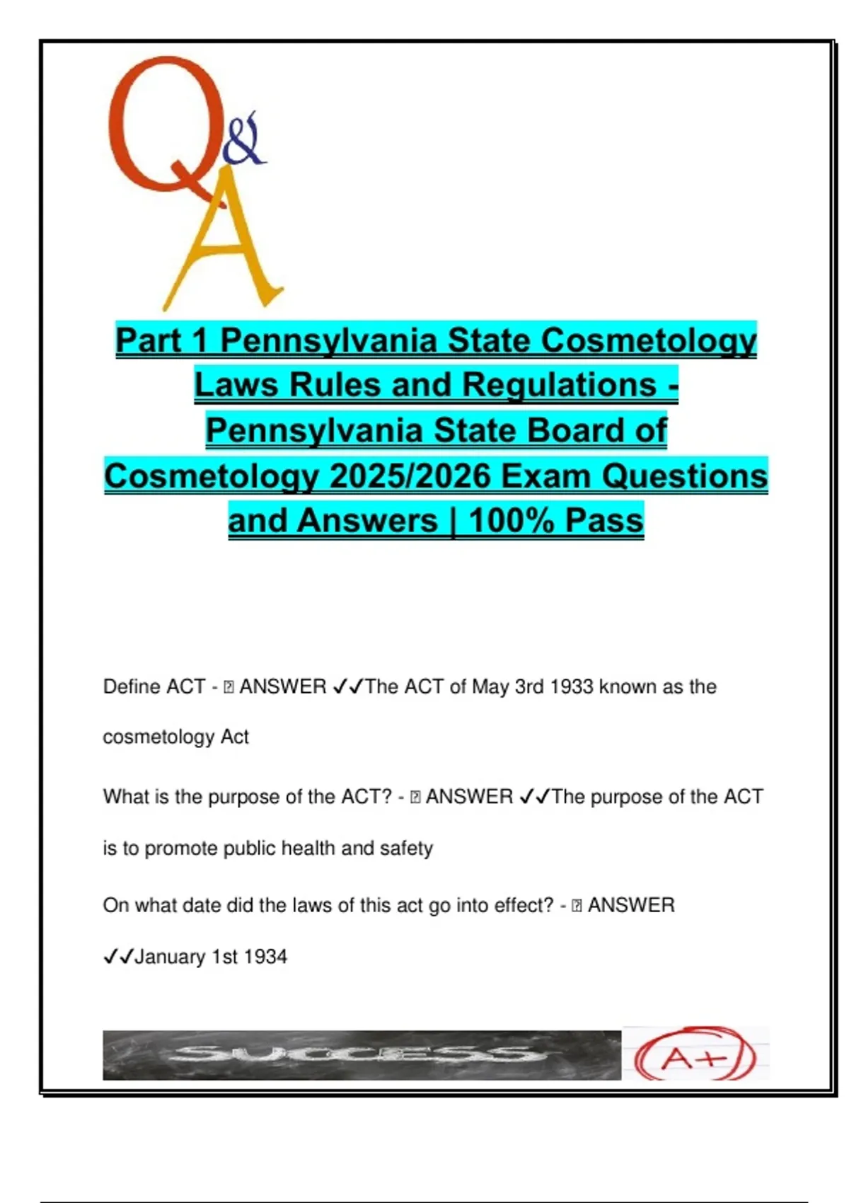 This document contains 100+ well-structured and accurate questions with answers, focused on the Pennsylvania State Cosmetology Laws, Rules, and Regulations as required for the 2025/2026 Law Exam. It is based on the ACT of May 3rd, 1933 (Cosmetology Act), and official guidelines set by the Pennsylvania State Board of Cosmetology. This resource is designed to prepare candidates for the legal and regulatory portion of the State Board Exam and ensures understanding of key administrative, professional, and disciplinary standards. Topics include: Licensing Requirements: cosmetologist, esthetician, nail technician, and limited license types; temporary license rules; escrow and reinstatement procedures Board & Legal Authority: Board composition (13 members), powers to suspend, revoke, or refuse renewal, public hearings, appeals, court procedures Definitions & Scope: cosmetology, esthetics, nail technology, booth space, tanning units, preceptors, and professional affiliations Sanitation & Safety Regulations: towel reuse, disinfection, prohibited items (e.g., powder puffs, neck dusters), cleanliness rules, and health requirements School & Salon Requirements: facility layout, licensing submission, ownership rights, signage, and equipment lists Compliance & Penalties: practicing with expired or unregistered license, penalty fees, criminal charges, and re-examination after 5 years Ideal for: Cosmetology students and apprentices preparing for the PA Law Exam Licensed professionals updating compliance knowledge Instructors and beauty schools teaching PA cosmetology law Salon owners and managers ensuring regulatory alignment This comprehensive guide ensures readiness for regulatory exams and supports compliance across professional cosmetology practices in Pennsylvania. Keywords: PA cosmetology law exam, cosmetology license PA, limited license, esthetician law, nail technician regulation, board powers, sanitation law, temporary permit, booth space PA, license reinstatement, cosmetology board definitions, salon license requirements