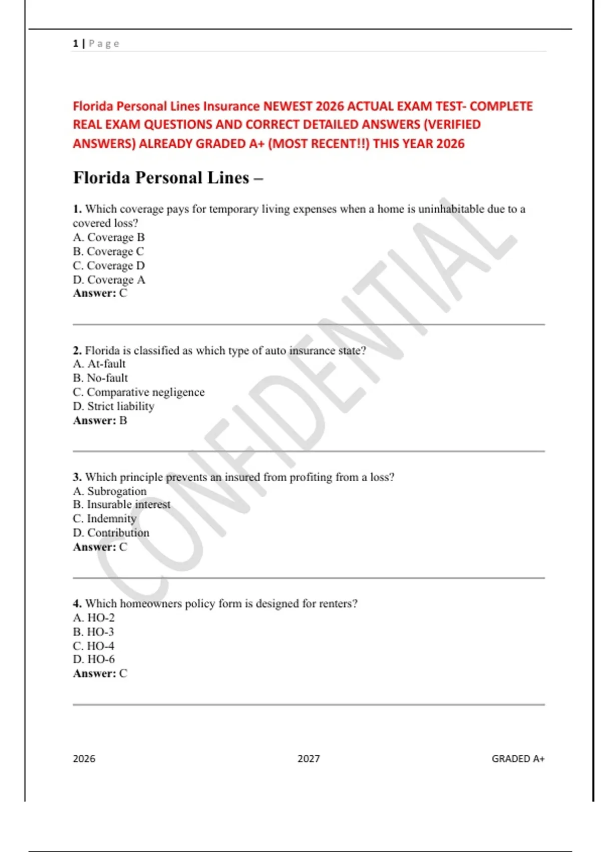 Florida Personal Lines Insurance NEWEST 2026 ACTUAL EXAM TEST- COMPLETE