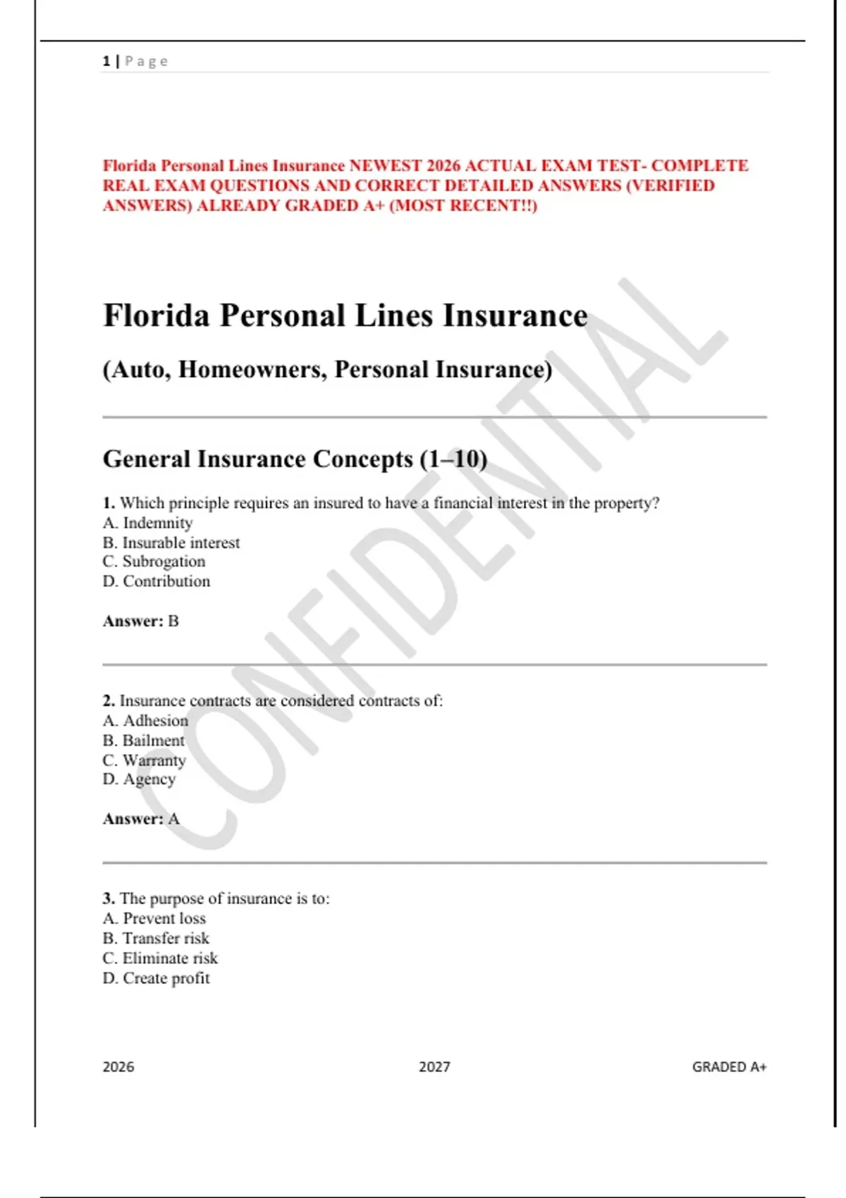 Florida Personal Lines Insurance NEWEST 2026 ACTUAL EXAM TEST- COMPLETE