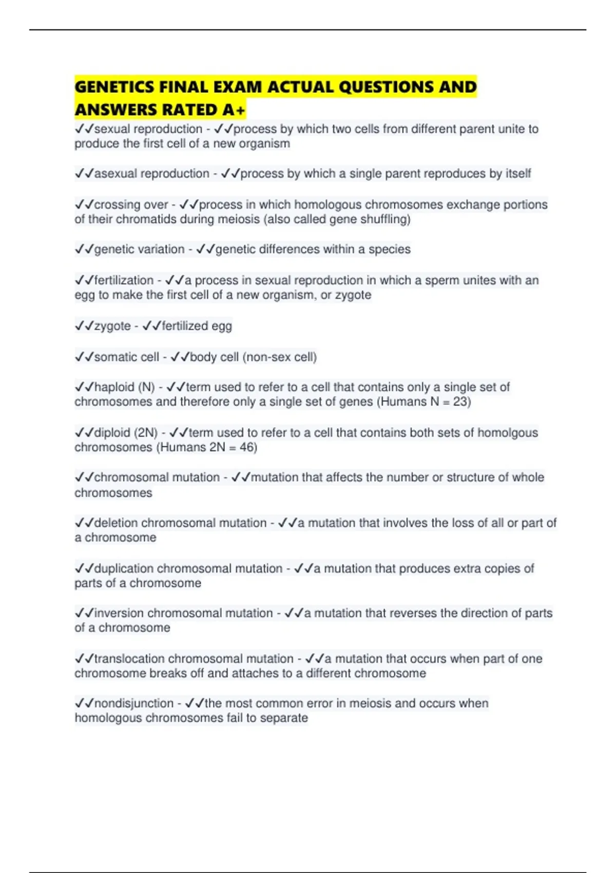 GENETICS FINAL EXAM ACTUAL QUESTIONS AND ANSWERS RATED A+