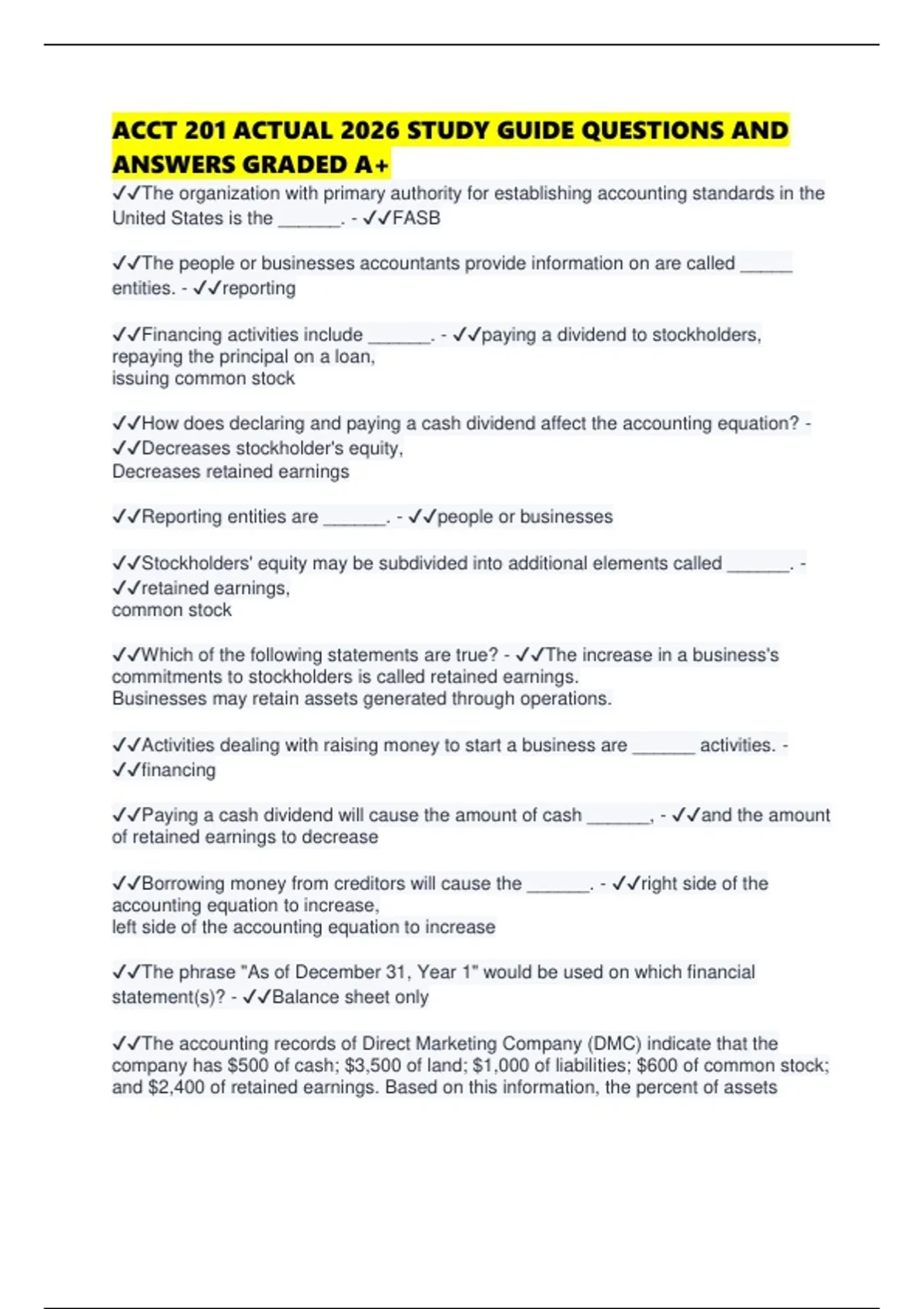 ACCT 201 ACTUAL 2026 STUDY GUIDE QUESTIONS AND ANSWERS GRADED A+