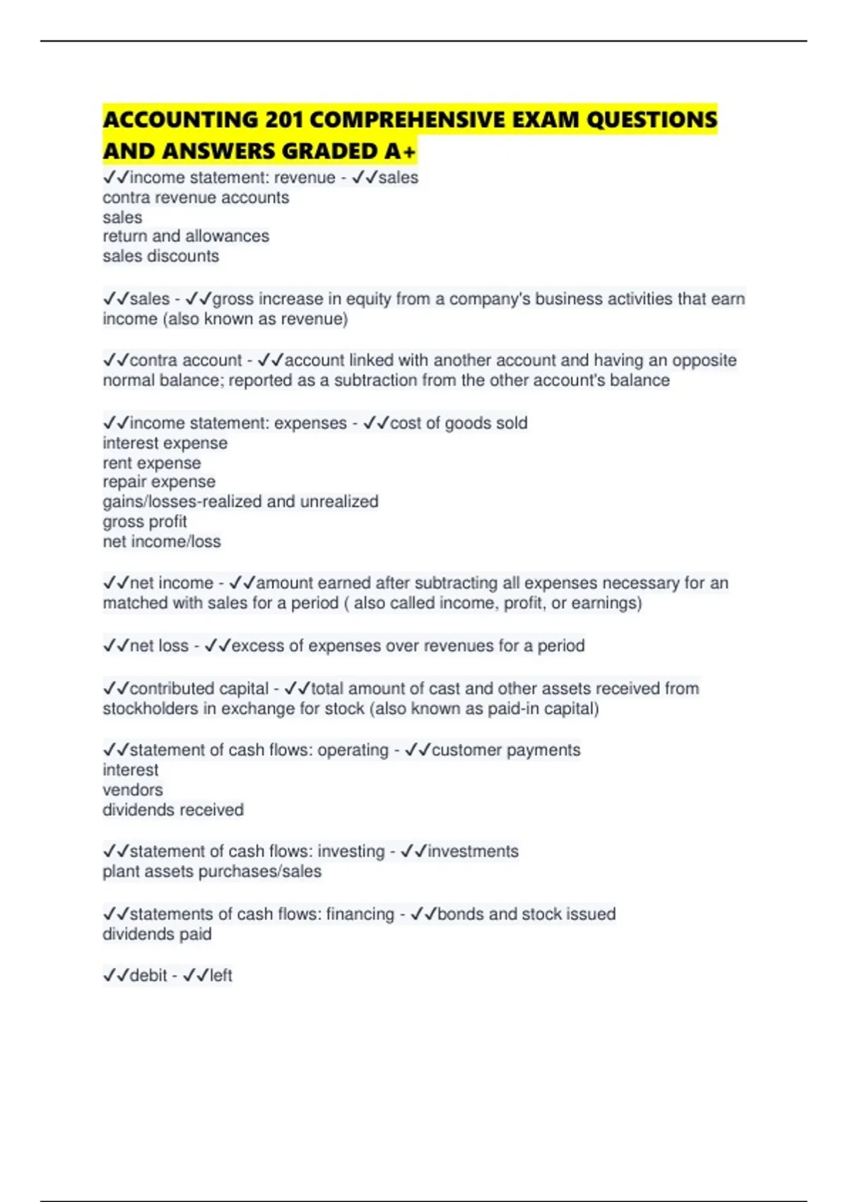 ACCOUNTING 201 COMPREHENSIVE EXAM QUESTIONS AND ANSWERS GRADED A+