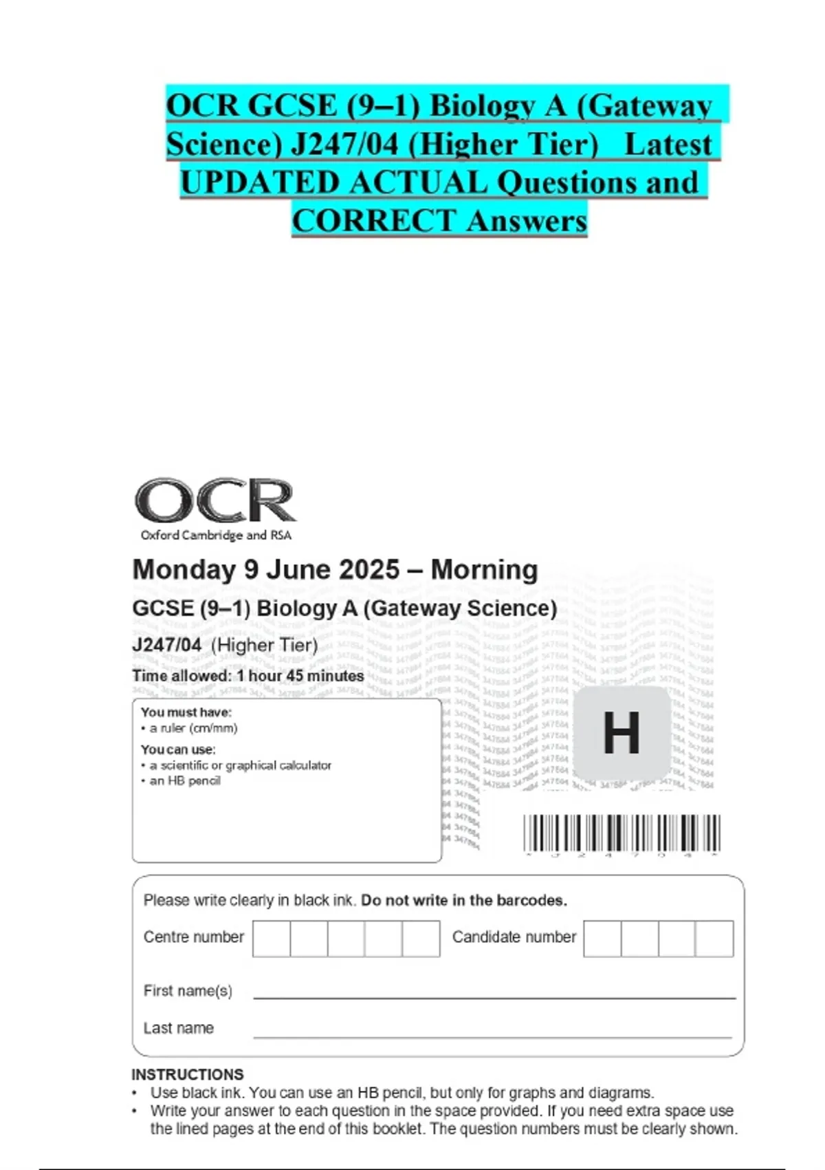 OCR GCSE (9–1) Biology A (Gateway Science) J247/04 (Higher Tier) Latest UPDATED ACTUAL Questions and CORRECT Answers