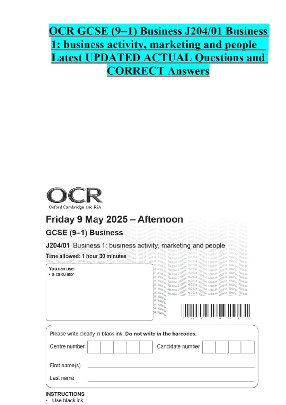 OCR GCSE (9–1) Business J204/01 Business 1: business activity, marketing and people Latest UPDATED ACTUAL Questions and CORRECT Answers
