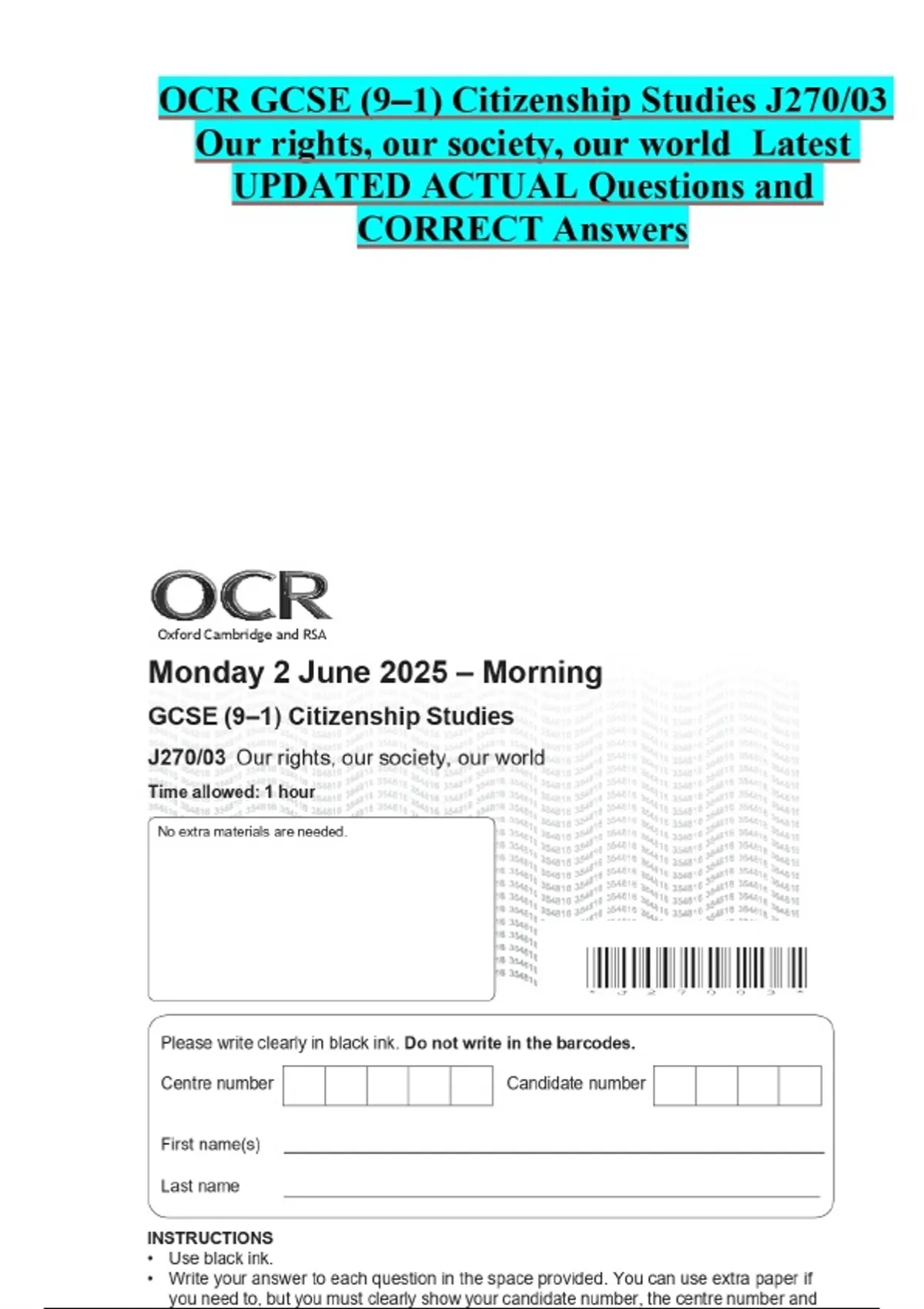 OCR GCSE (9–1) Citizenship Studies J270/03 Our rights, our society, our world Latest UPDATED ACTUAL Questions and CORRECT Answers