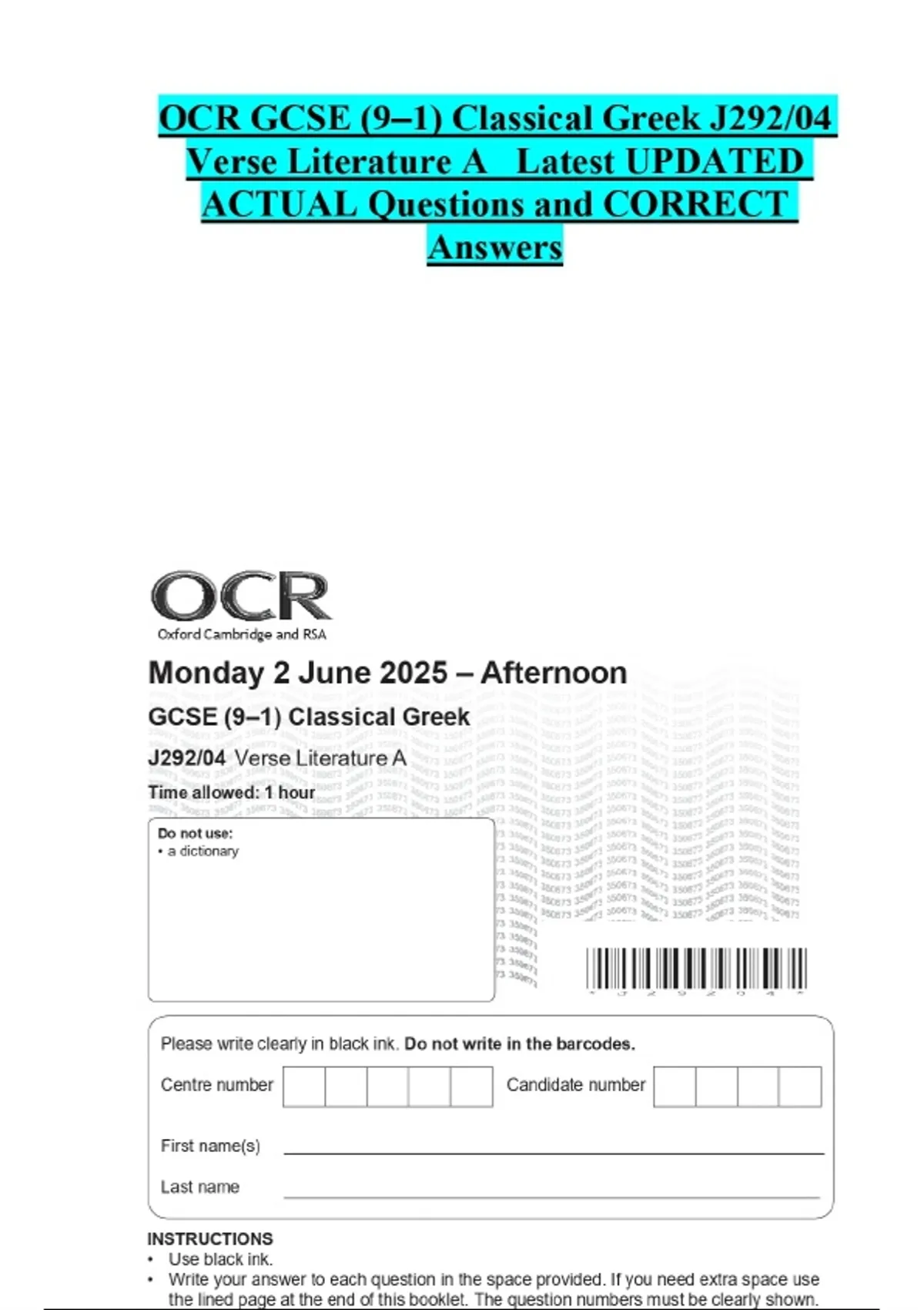 OCR GCSE (9–1) Classical Greek J292/04 Verse Literature A Latest UPDATED ACTUAL Questions and CORRECT Answers